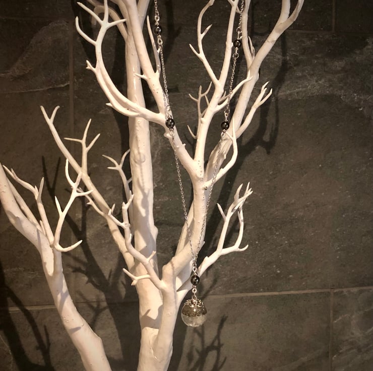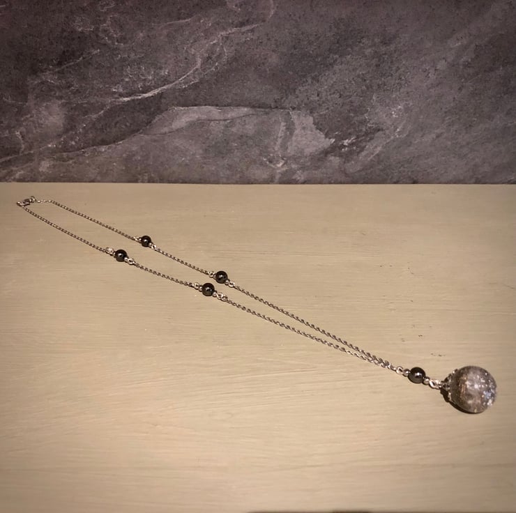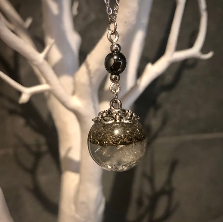 On my days, if you are looking for something absolutely stunning with amazing energies this beautiful Sphere Drop Pendant is for you. Encased in the resin Sphere is one of the most amazing crystals ever discovered Clear Quartz! Silver leaf and mixed metal shavings are also incorporated, glistening and catching the light. And finishing off the design of the sphere is a Tibetan style bead cap.
