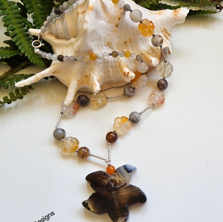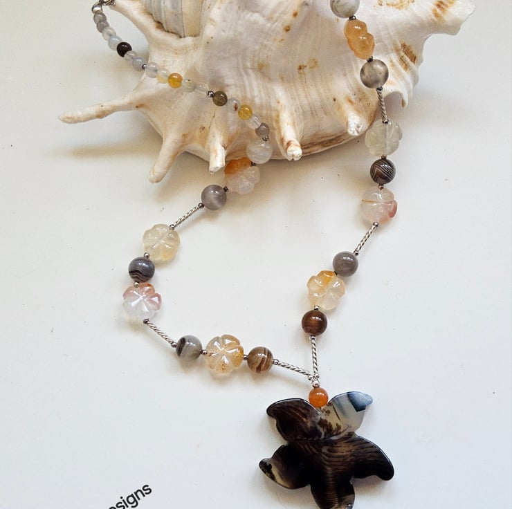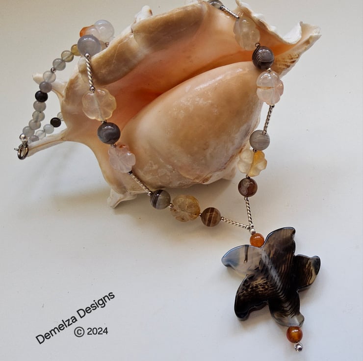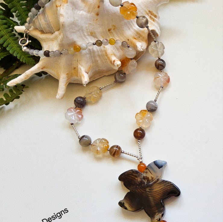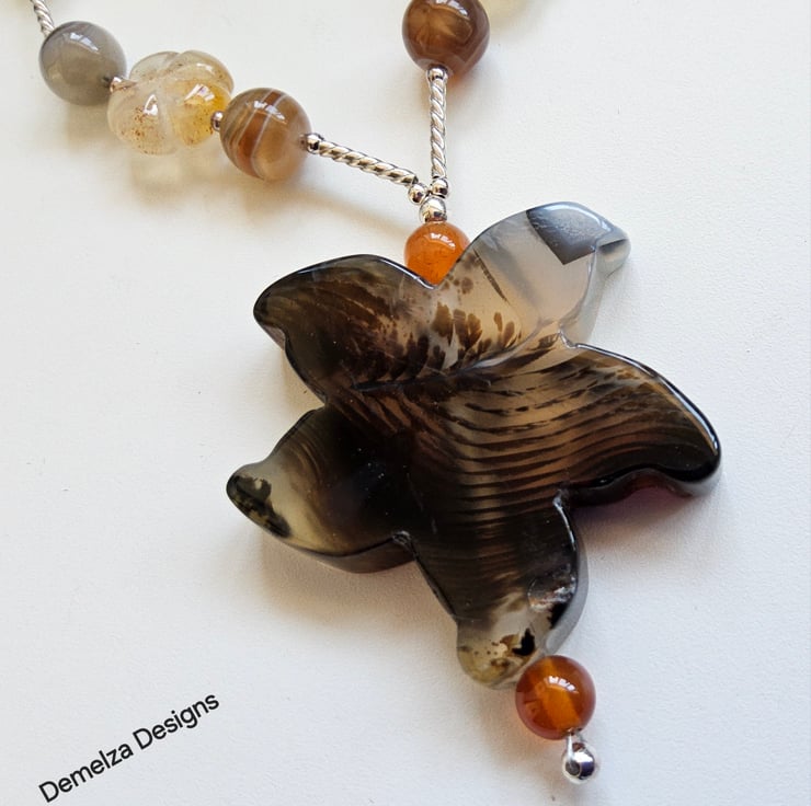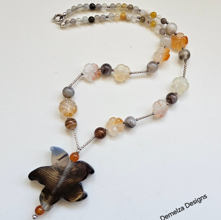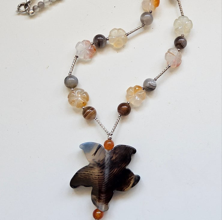 A very unique ete catching necklace designed and hand crafted using a mix of genuine gemstones. The centre Botswana flower agate has been hand carved by experienced lapidorist. It measures 4 cms in length and 4.5cm wide. At the bottom and top are two 4mm carnelian smooth cut rounds. The necklace design repeats itself on both sides with sterling silver tubes and small beads. Within the design are hand cut smaller carnelian flower beads. Towards the back of the necklace are micro cut 3mm Botswana agate rounds finished off with a 925 sterling silver bolt ring clasp. For the main construction professional stainless steel coated jewellers wire has been used for added strength and lasting durability.