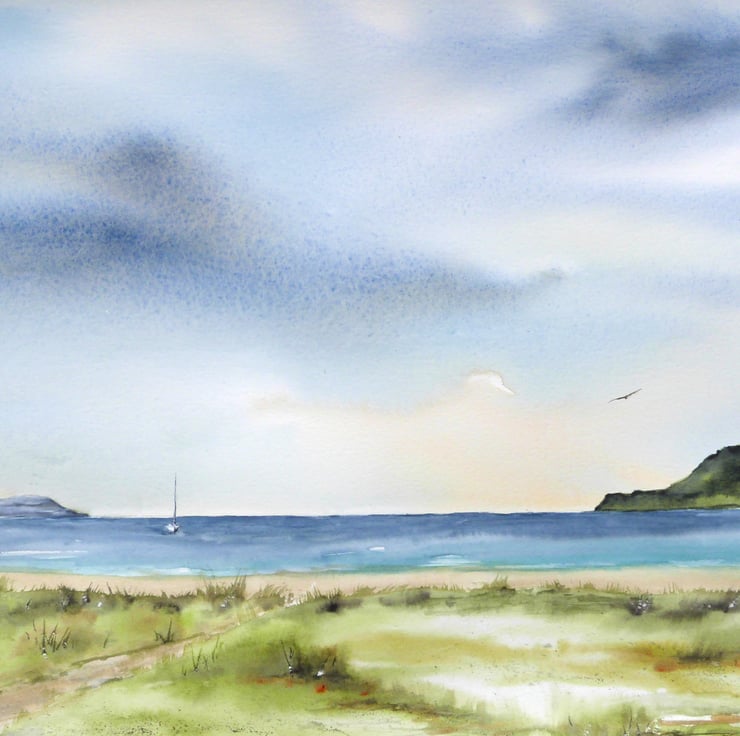 My paintings are inspired by places, memories and nature. Sometimes I produce work from my imagination, sometimes from a reference photo. Located on the coast of the Looking out over Calgary Beach, a lovely day on the beautiful Isle of Mull.