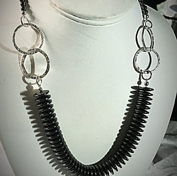 Beautiful button shape Hemitite beads with textured solid silver links. Length approximately 45cm (18 inches) long.