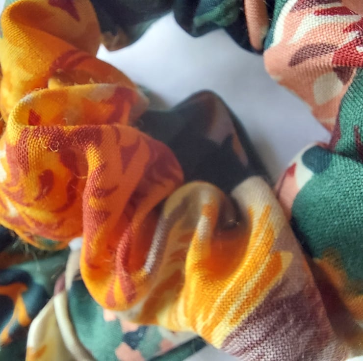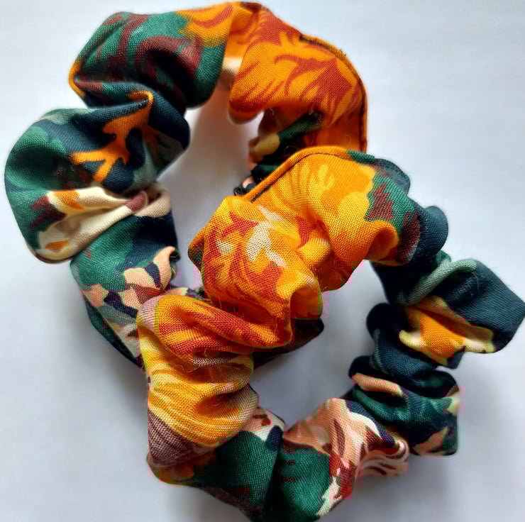 These scrunchies have been handmade using 100% cotton fabric with a bold floral print - oranges, greens, browns and yellows.