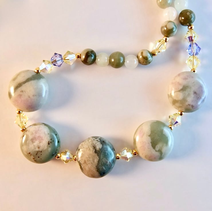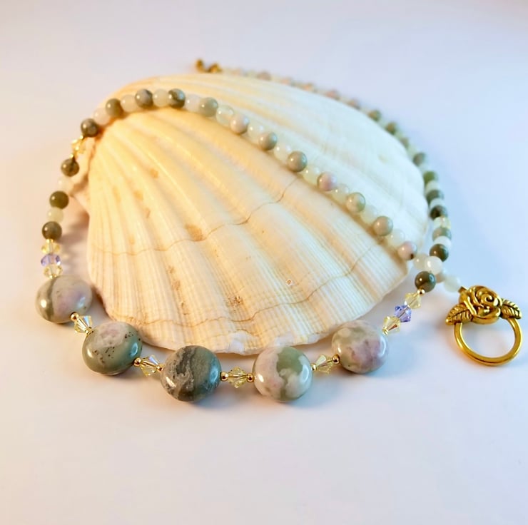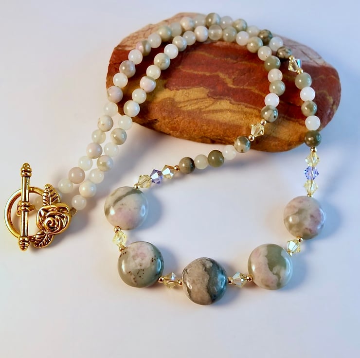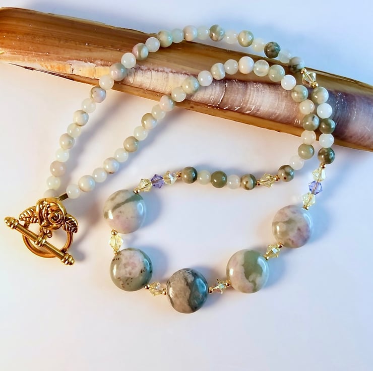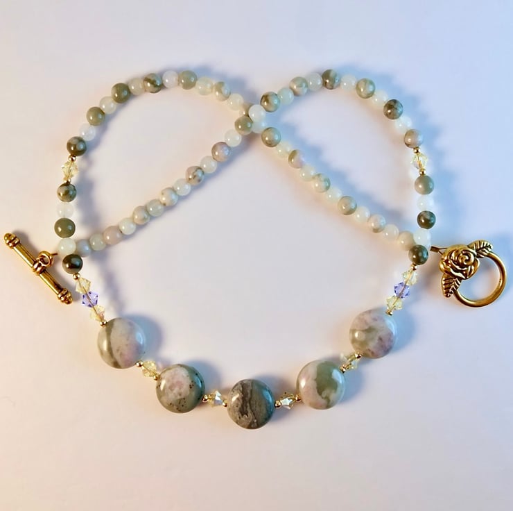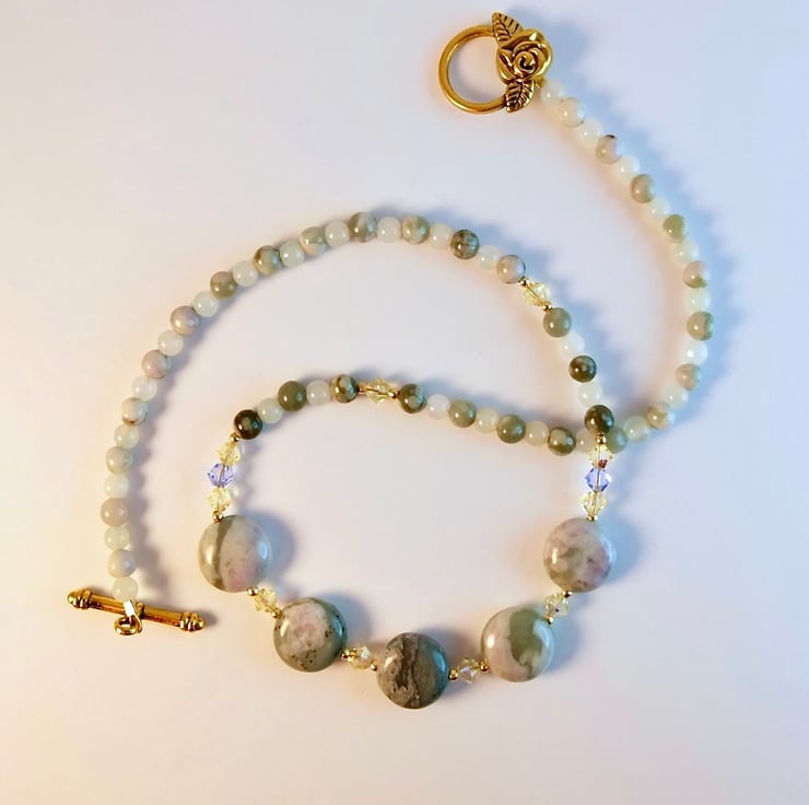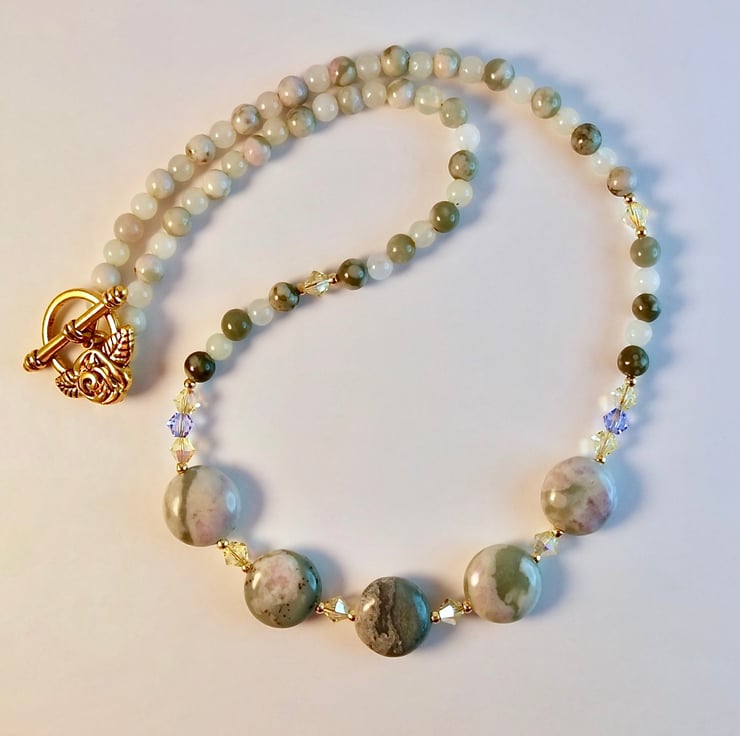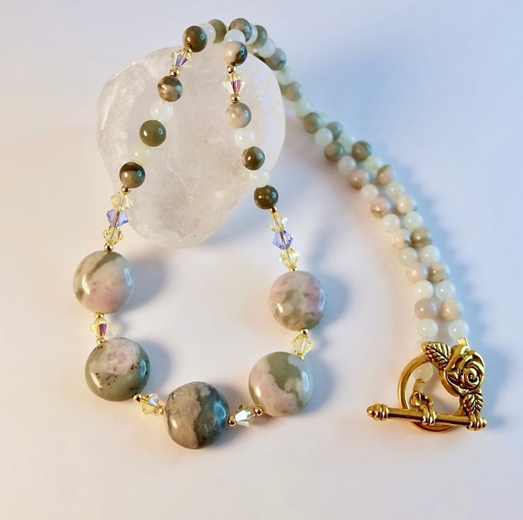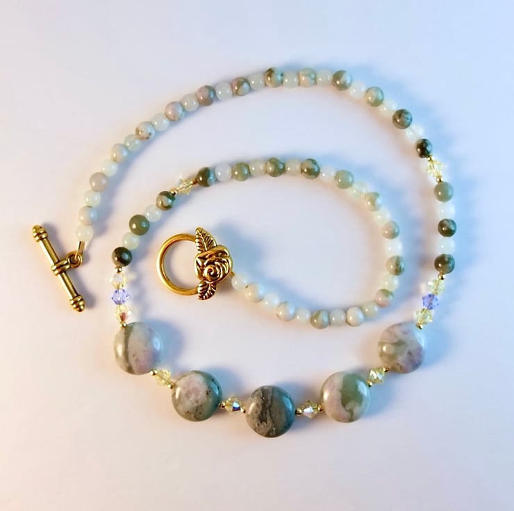 The necklace graduates to alternating 4mm Peace Jade rounds and 4mm New Jade, and finishes with a rose toggle clasp.