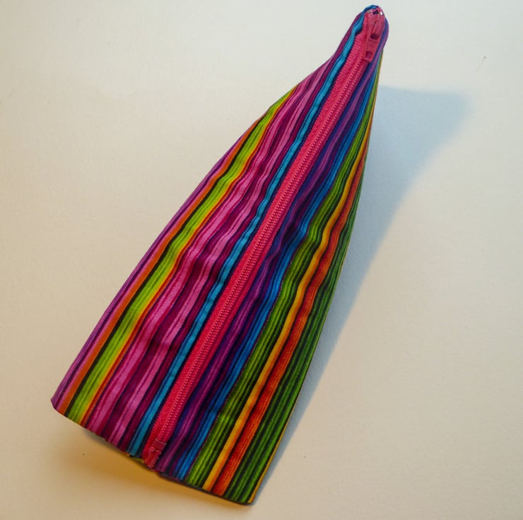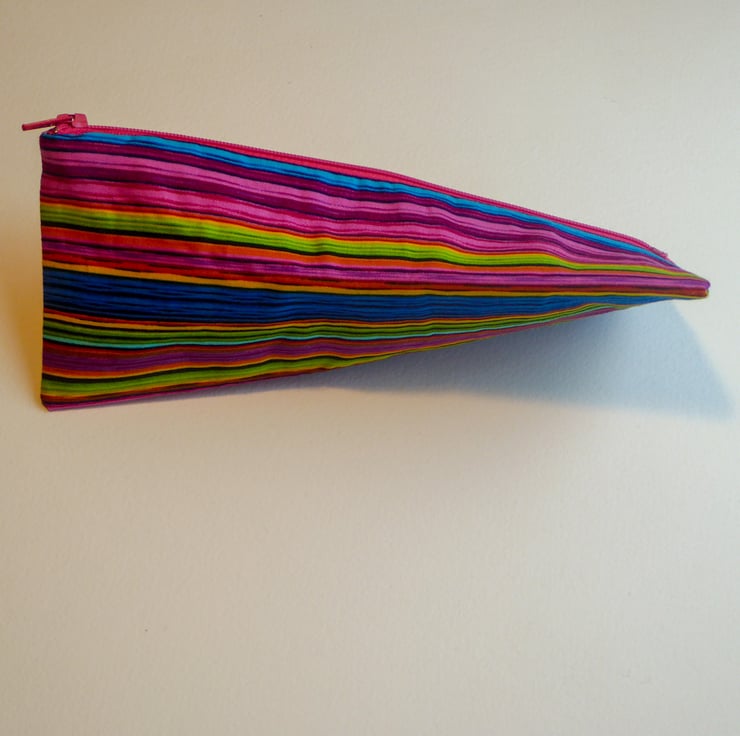 A triangular zippered pouch made in brightly coloured striped quality cotton, interfaced to stiffen, suitable for pencils/stationery/small treasures/craft supplies/makeup.
