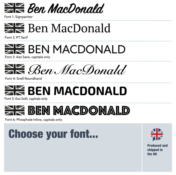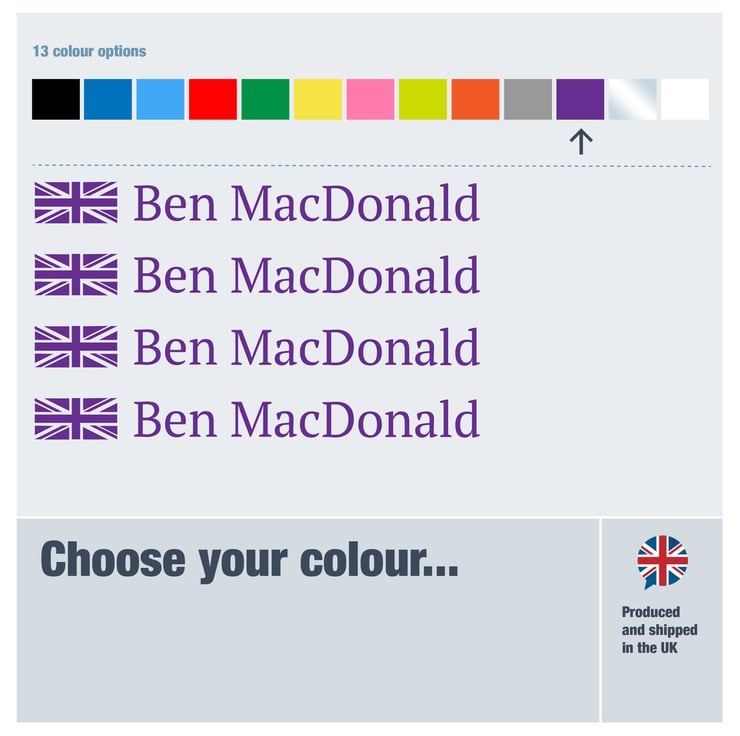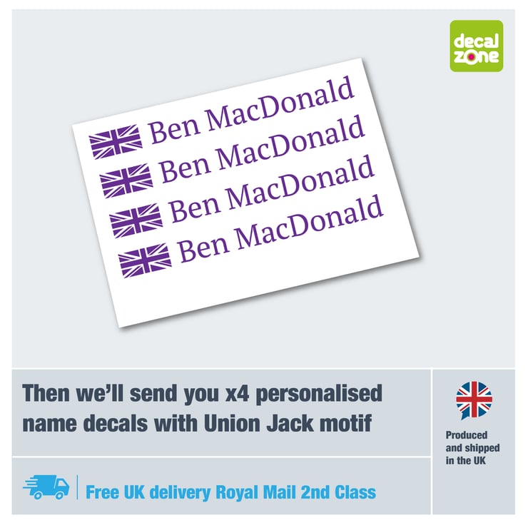 These decals are personalised and cut to order with your exact name as requested by you with the Union Jack flag (in single colour). Please leave a message at the check out with the name to appear on your sticker. (Please note, fonts 3, 5 and 6 will be in CAPITALS only. Fonts 1, 2, and 4 will be Case Sensitive).