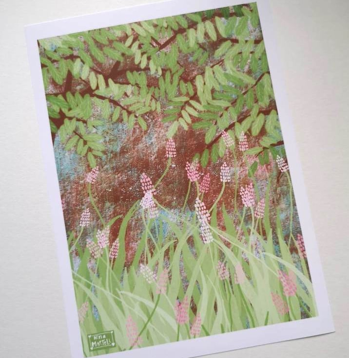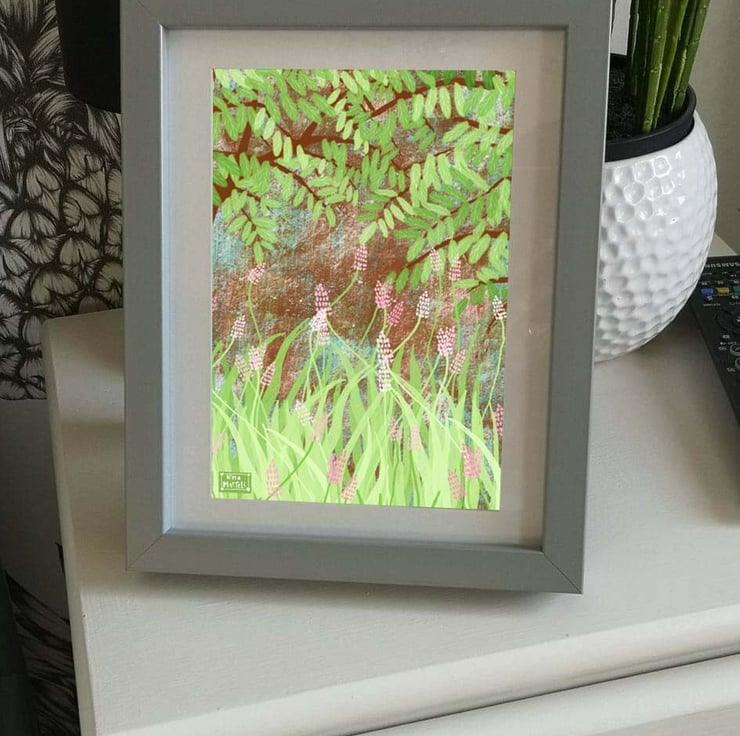 This is an A4 print of my Spring illustration. Featuring grape hyacinth and fresh green grass and new leaves on the trees. A real feeling of Spring is in the air.