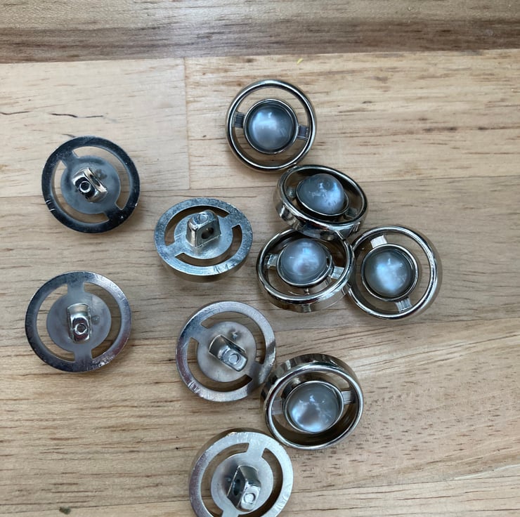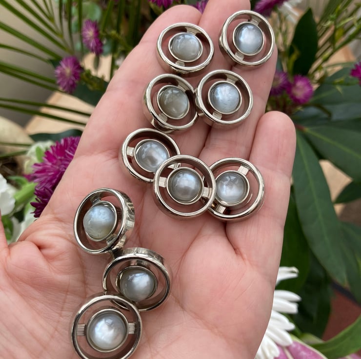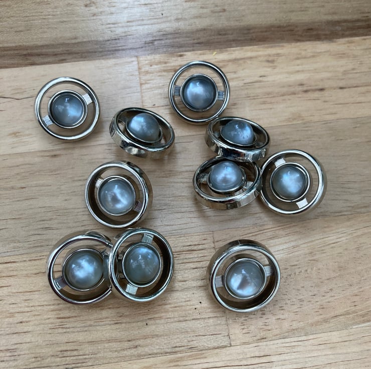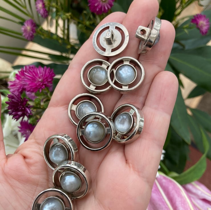 A set of 10 silvertone metallic lucite vintage buttons that have a central blue grey faux moonstone cabochon in the centre of each button, the back has a loop shank, they’re rounded, with smooth edges with cut out design in a semi circle around each central cabochon, which catches the light beautifully and are flat at the back.