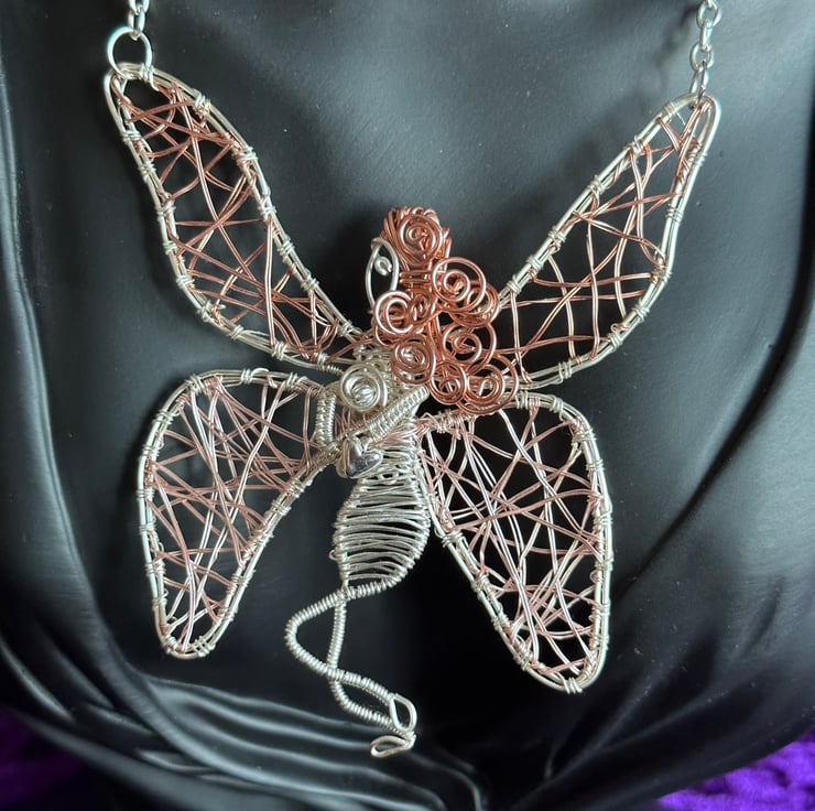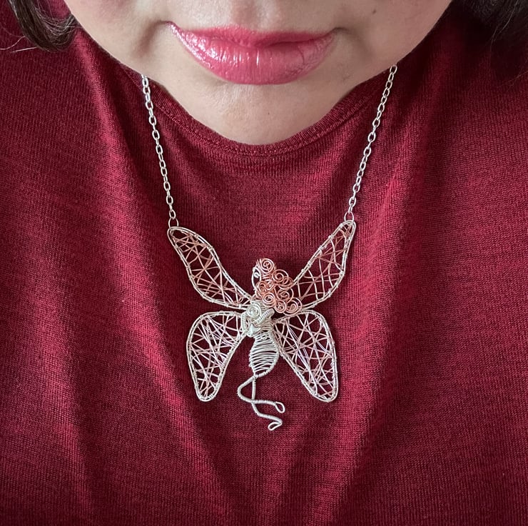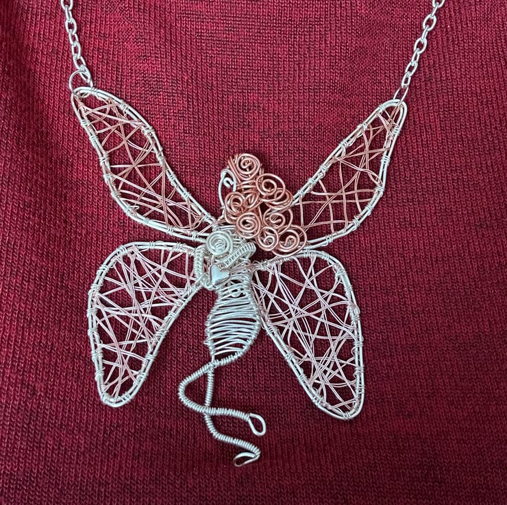 Introducing you to 'Ellie' the Fairy, who has been intricately handmade in my home studio, using sustainable copper craft wire and silver plated craft wire and her lower wings were wrapped with a rose gold plated copper. She not only brings something unique and head-turning but she is one of her kind due to shaping her and making her freestyle.