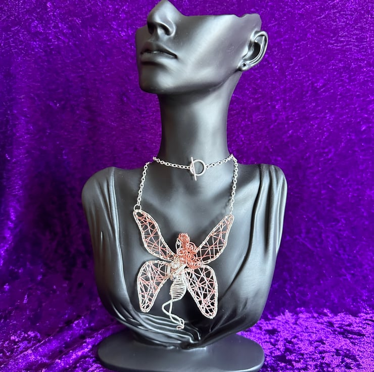 Measures approximately 9cm in length and wingspan at the widest point. Ellie is a 21 inch, bare cooper and silver plate copper necklace set with a toggle clasp the the back.