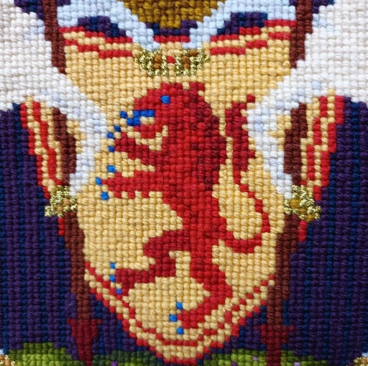 The Honours of Scotland are pictured on the topmost red lion, the Crown of Scotland is above the shield and is worn by each unicorn.