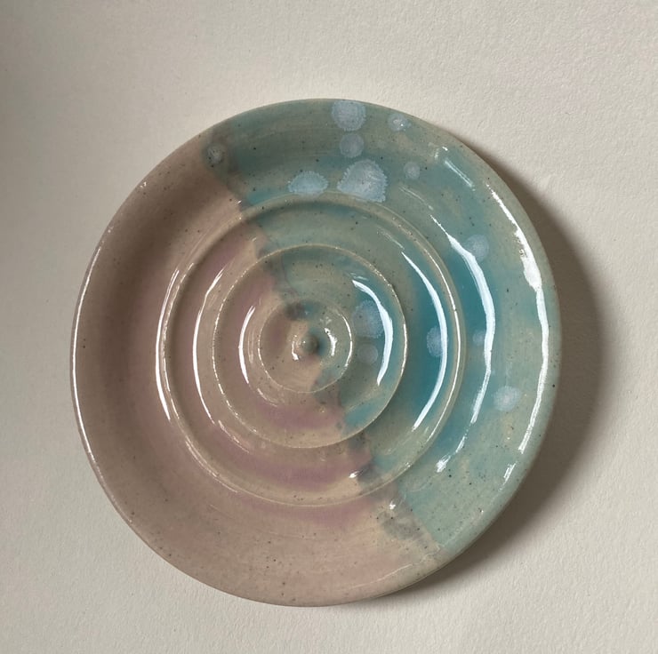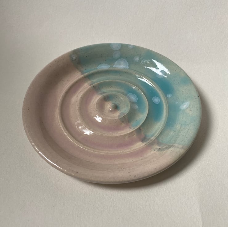Handmade soap dish made with stoneware clay thrown on my potter's wheel. Glazed in celadon green and pink.
