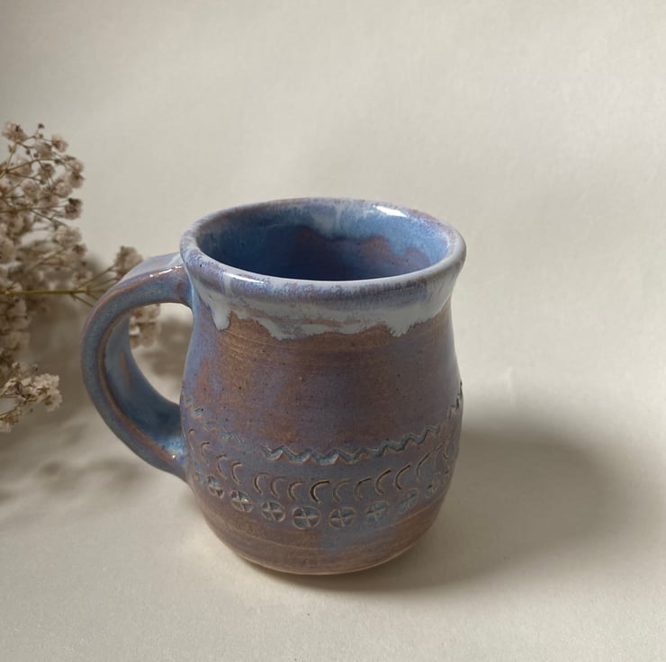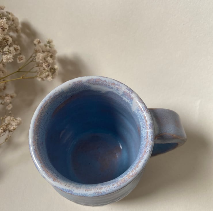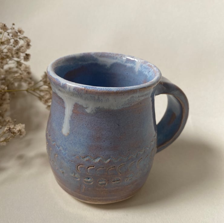 Wheel thrown and carved small espresso mug using white stoneware clay. Carved and hand painted with a purple coloured glaze with white drip effect. Fired to 1200 deg C.