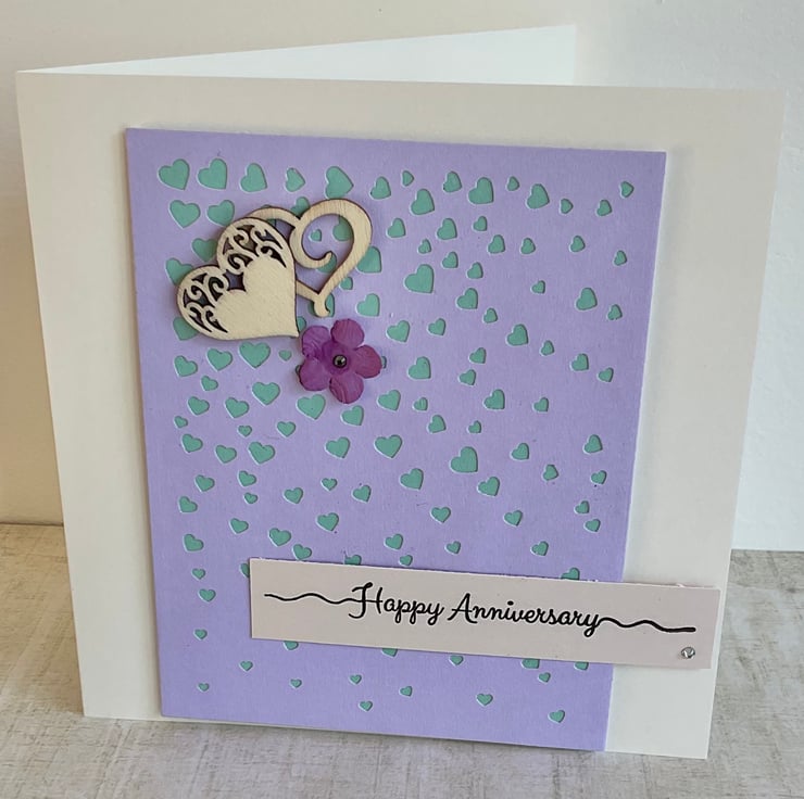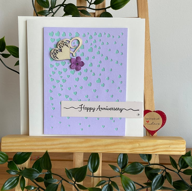 The message reads ‘Happy Anniversary’. Two wooden hearts and a paper flower embellish the card.