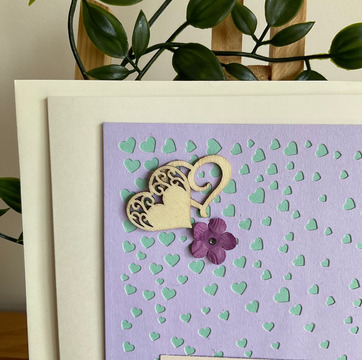 This card features a cascade of die cut green hearts across a purple base which has been raised up to give a 3D effect.