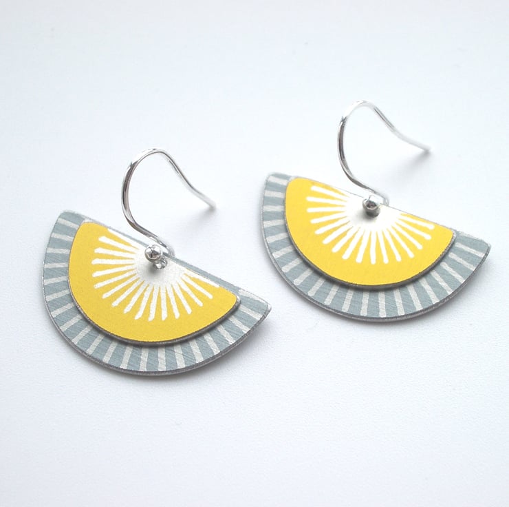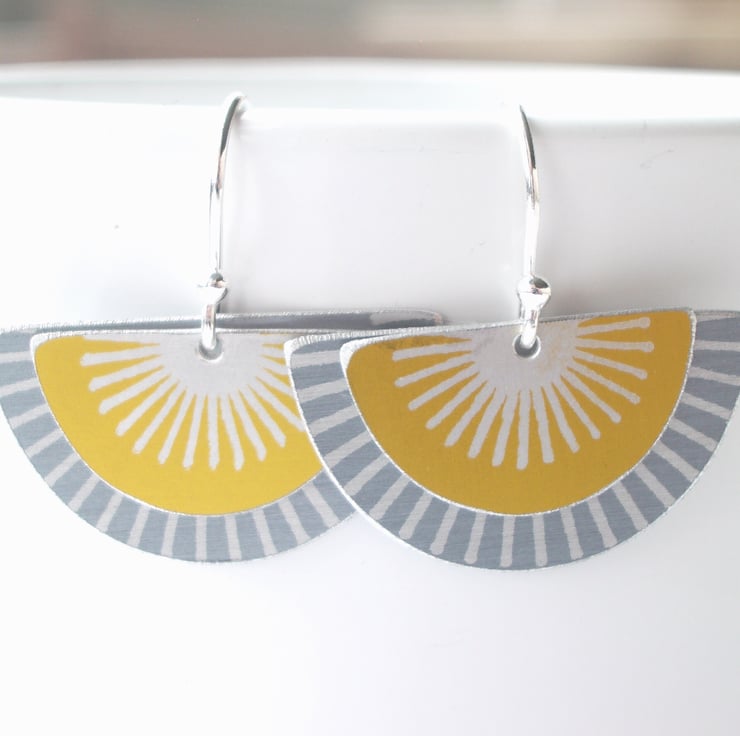 These striking fan shaped earrings are made from aluminium which I have dyed in grey and yellow and printed with a silver sunburst pattern. The dye is made permanent through heat and becomes part of the surface of the metal. I have saw pierced the two separate semi circles by hand and hung them on a sterling silver ear hook.