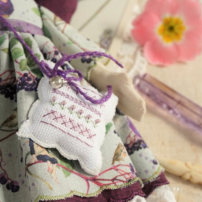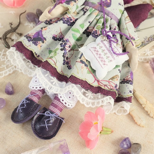 This is Sureau. A smaller pattern, she is about two thirds the size of my witch. This little Spring Fairy God Mother has a Daniela Drescher print dress with elderberries abounding which is called Elder Elf, gorgeous quality. She has wings that match her underskirt and sports a little felt wand. Her shoes are the smallest I have ever made and are leather. She has a piece of amethyst to her heart with lavender in her stuffing and is finished with tiny buttons, organza ribbon and a little coronet in her hair.
