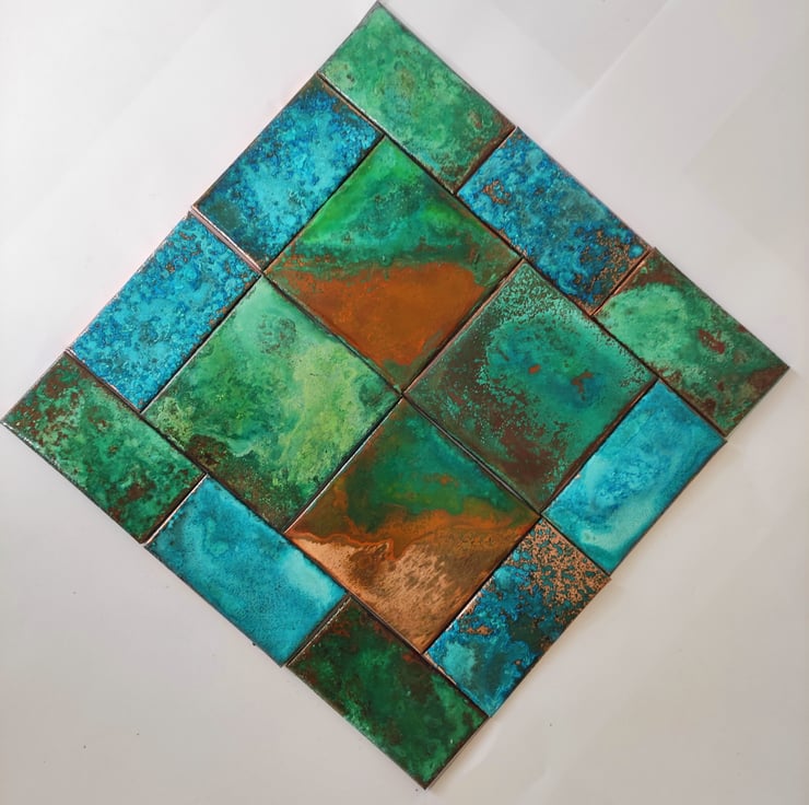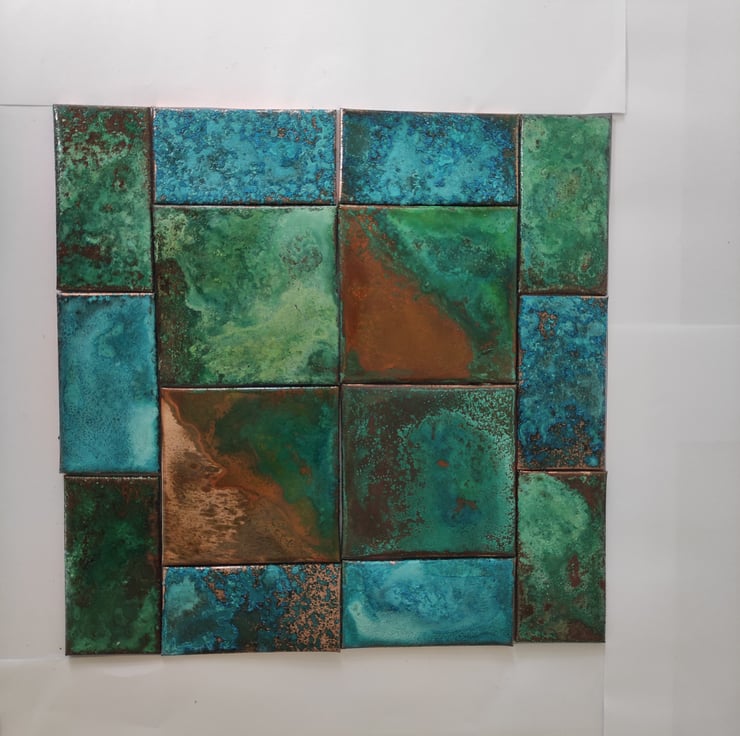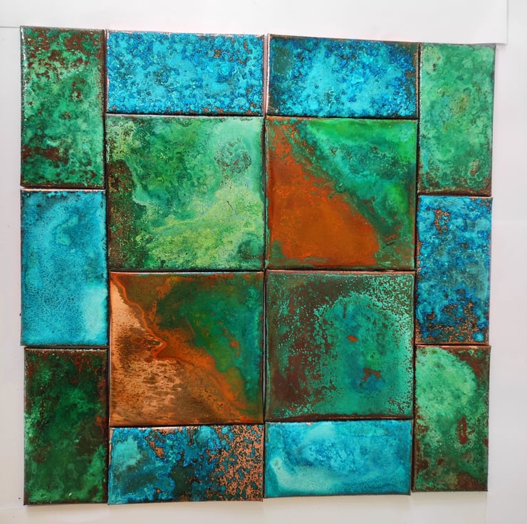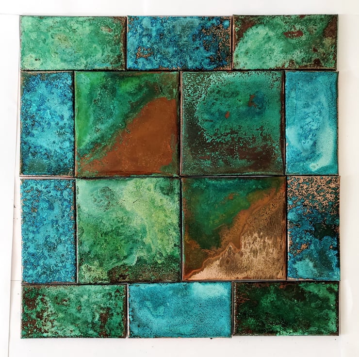 Creating copper tiles with a hammer and anvil is a craft that has been around for centuries. It requires skill, patience, and time to create these unique pieces of art. Copper tiles have natural oxidation which gives them their beautiful patina over time making each tile truly one-of-a-kind.