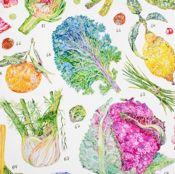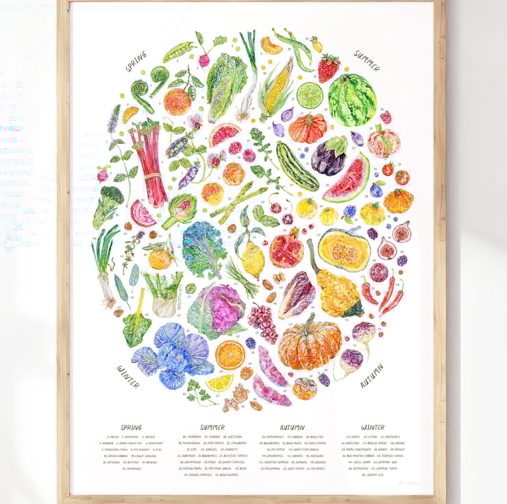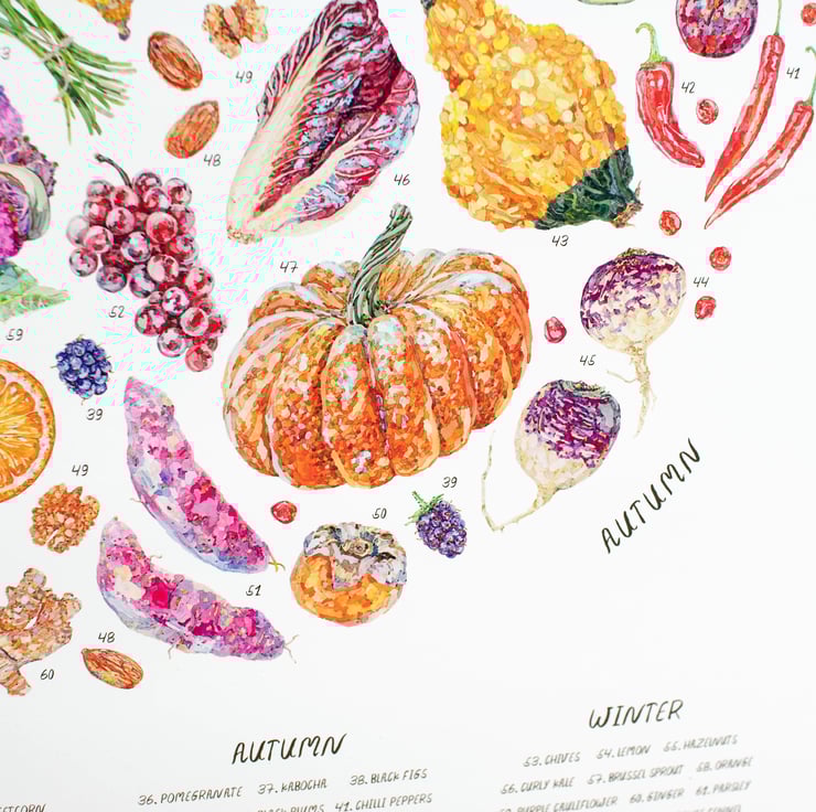 Rich in textural details and vibrant colours, this print is designed to help you navigate through the seasons, highlighting a beautiful range of seasonal fruits, vegetables, nuts and spices.