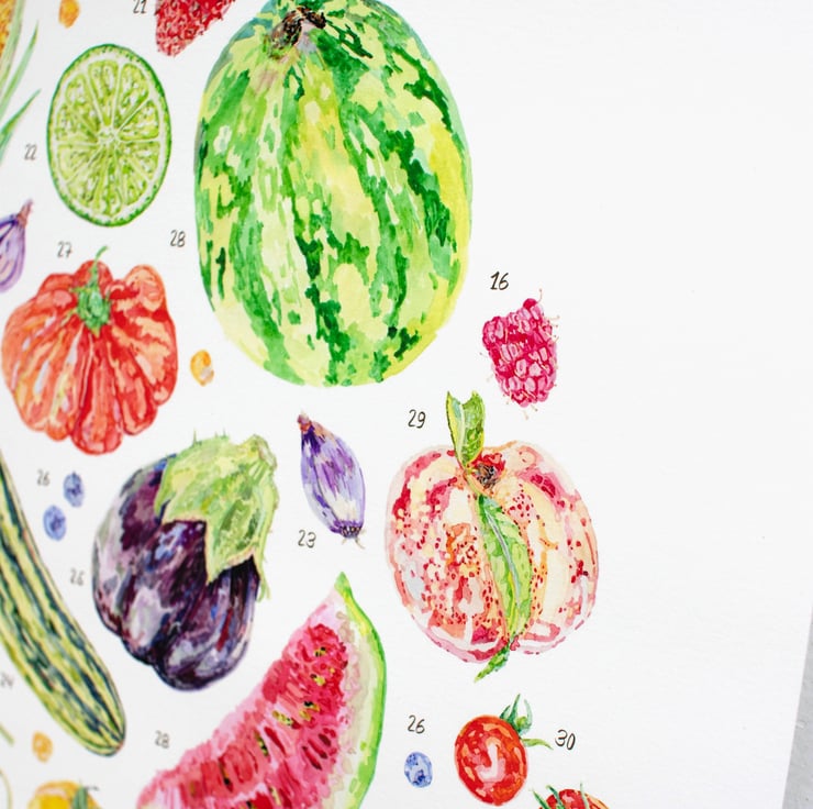 Each fruit, vegetable and spice was lovingly hand painted in my studio, and carefully reproduced as a high quality Giclée art print, printed on sustainable paper with eco inks.