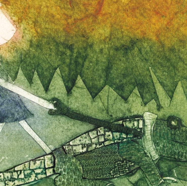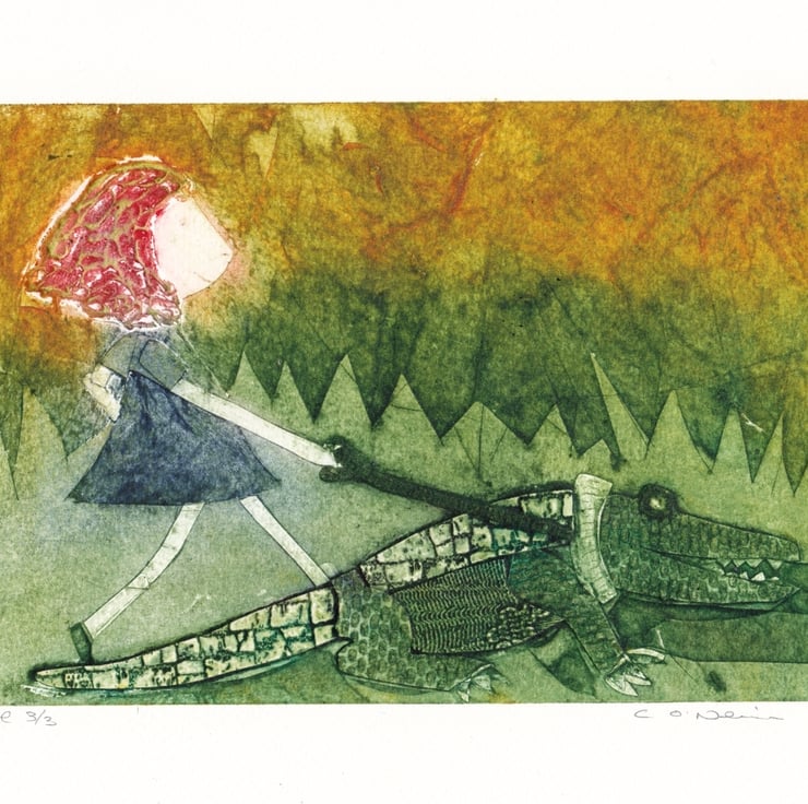 Original collagraph print of a pet crocodile going for a little walk.