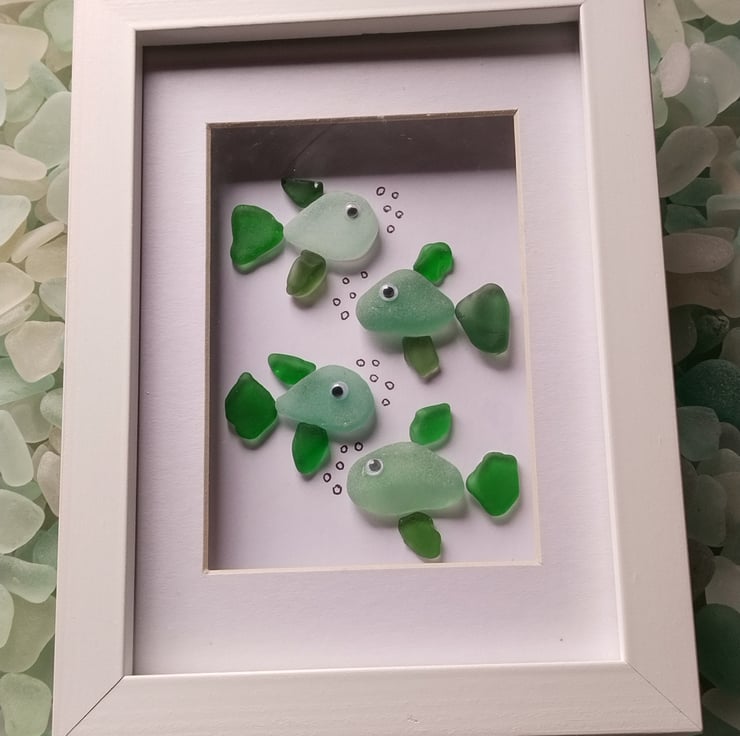 Made from genuine Scottish Sea Glass, this cute little picture is guaranteed to bring a smile to any sea glass collector. These four little fish are searching for their new home!
