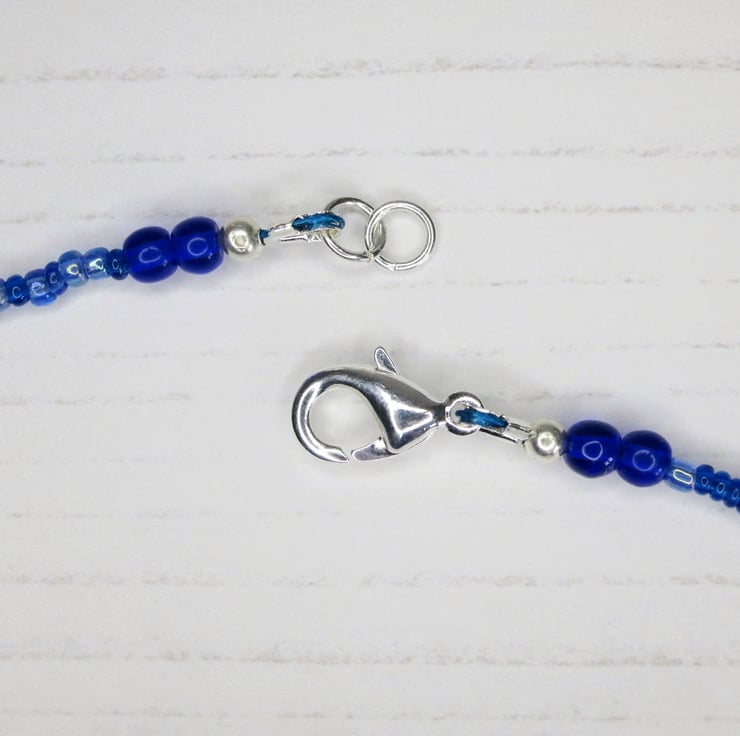 The Bird charm and beads have been threaded on to blue beading wire, finished with wire guards and secured with a silver plated lobster catch and two jump rings giving you a choice of size for fastening.