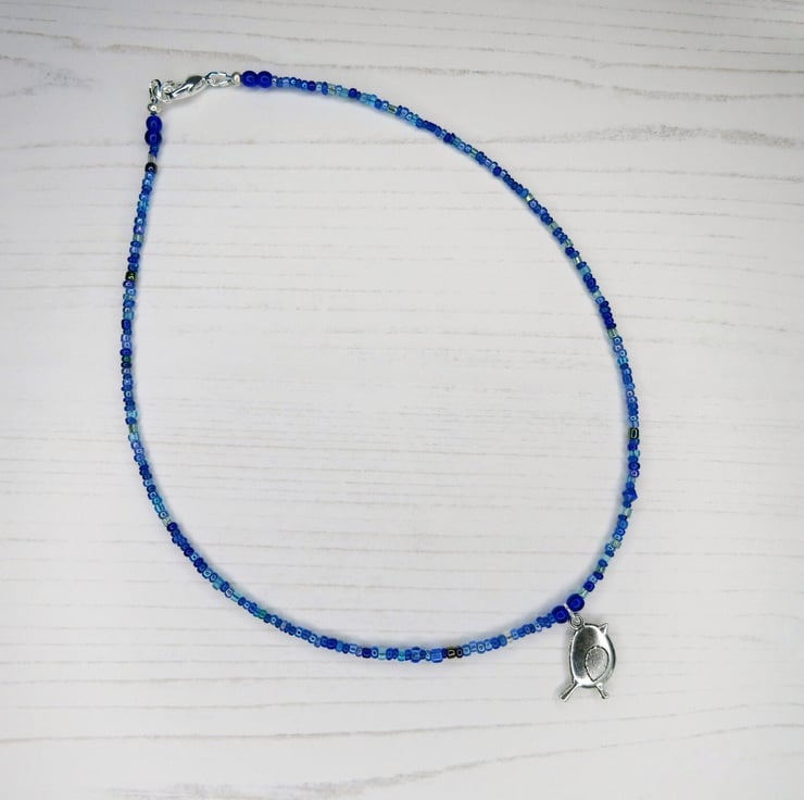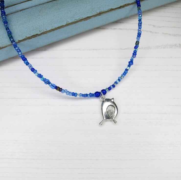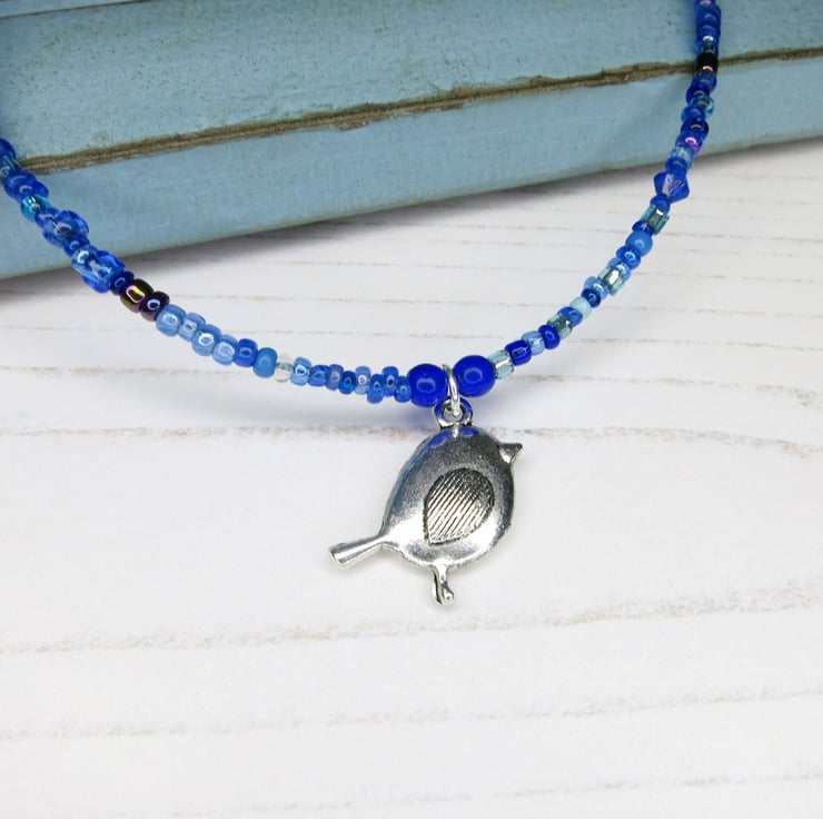 Simple style shorter length necklace in a mix of little blue glass seed beads with a metal Bird charm.