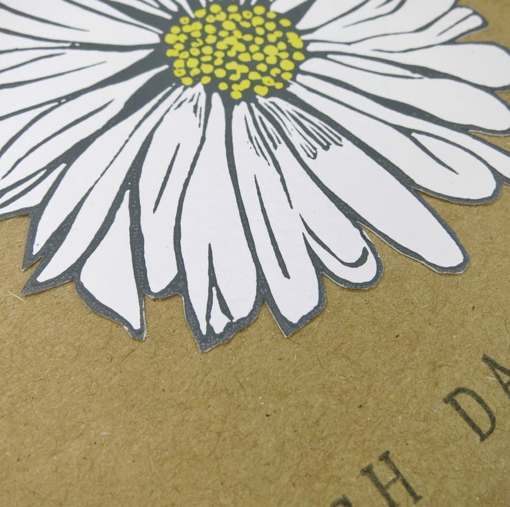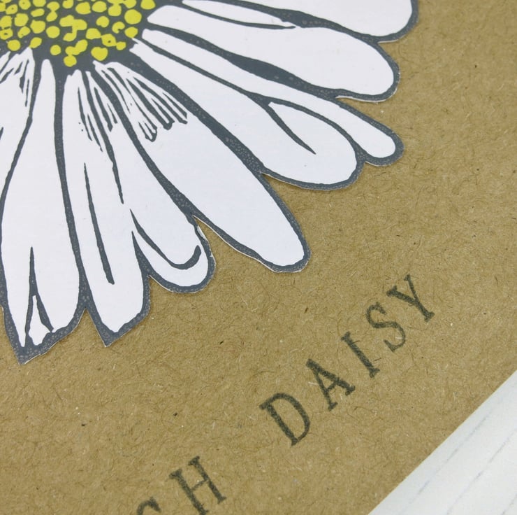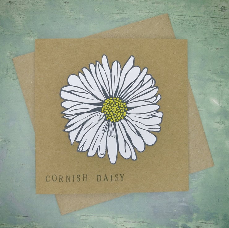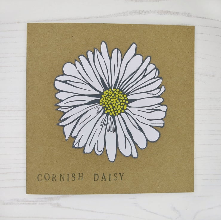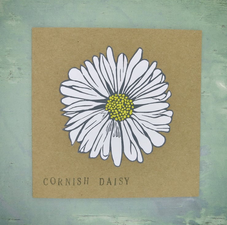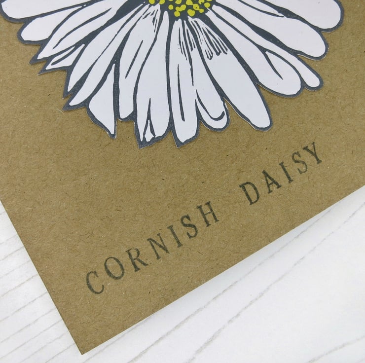 Hand printed Lino cut of a Cornish Daisy with a hand-coloured centre. I've carefully cut out and mounted the Daisy on recycled Kraft Brown card and added stamped lettering.