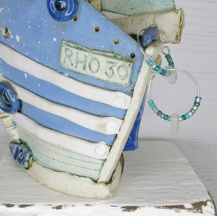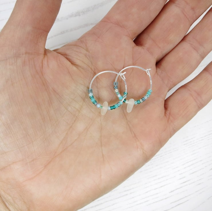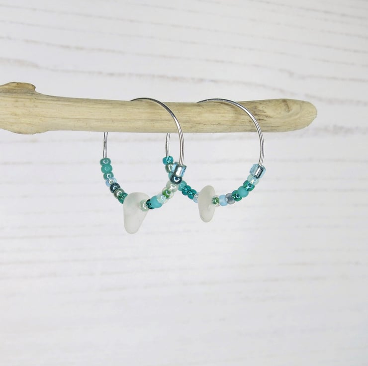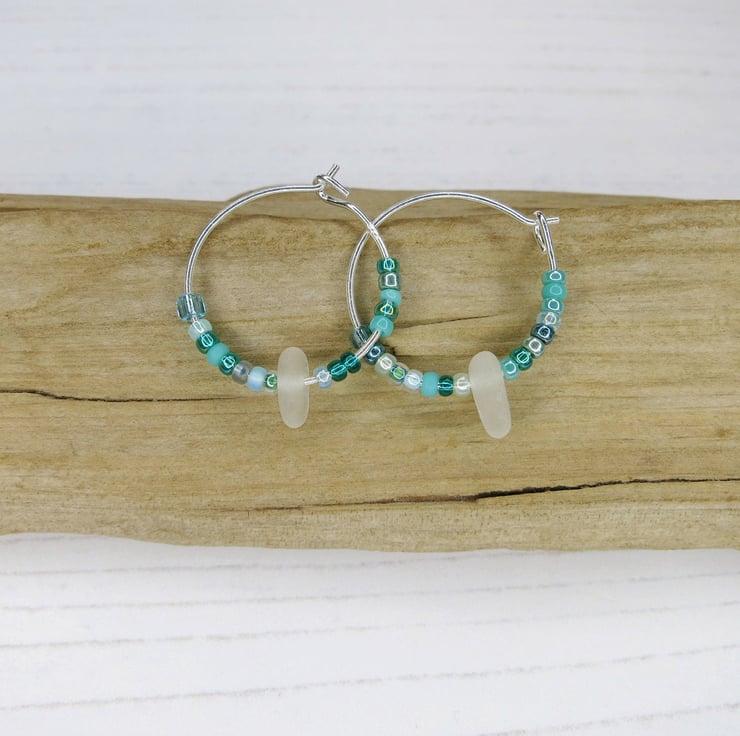 Sterling silver 18mm hoop earrings with Cornish sea glass and a mix of tiny turquoise seed beads.