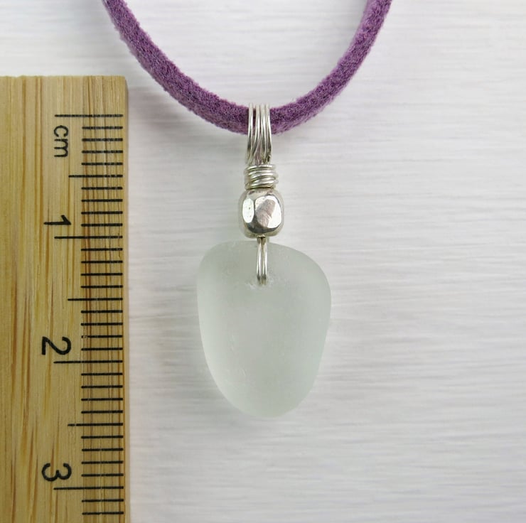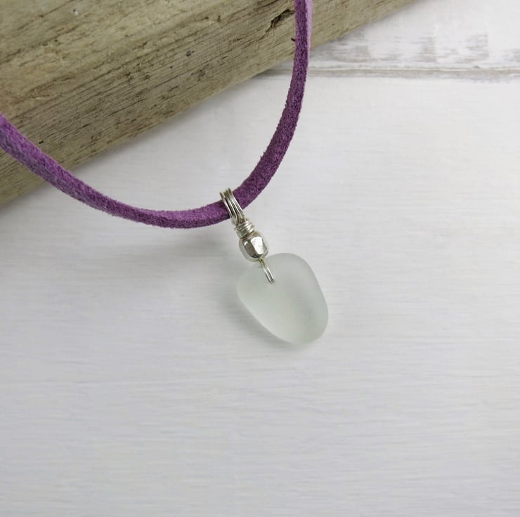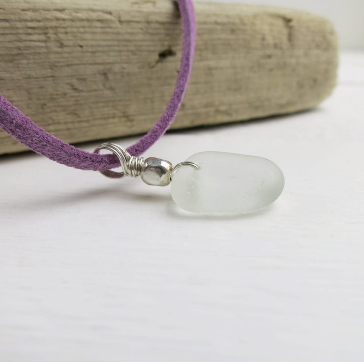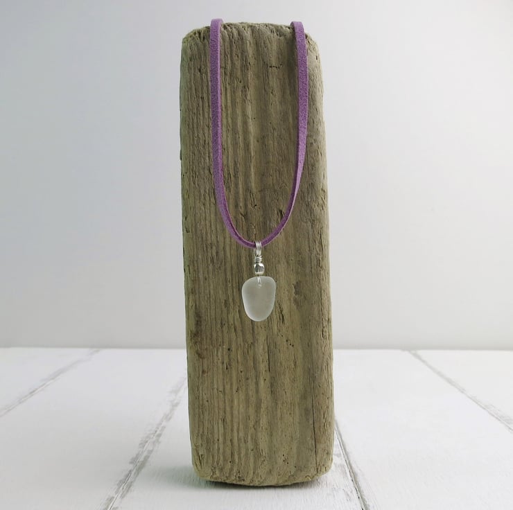 This lovely white piece of sea glass has been added to a pretty lilac faux suede necklace, attached using sterling silver wire with a small hammered bead.