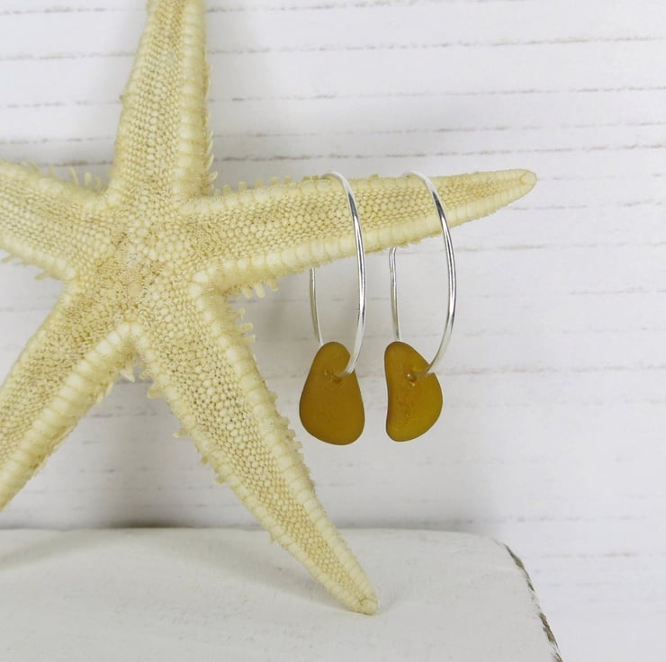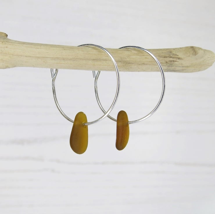 Burnt orange Cornish sea glass on a simple pair of dainty sterling silver 18mm hoop earrings.