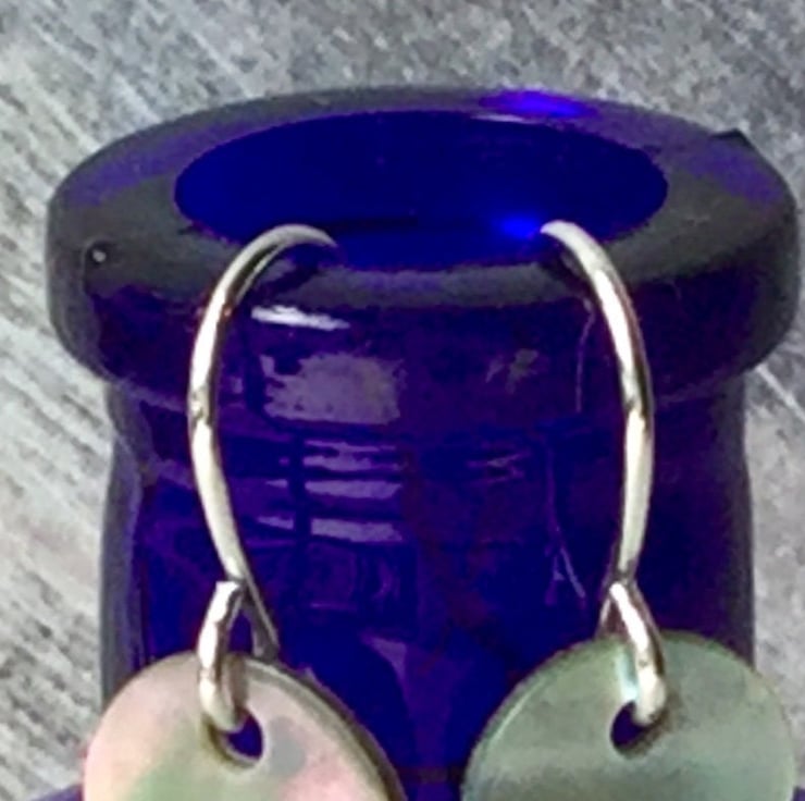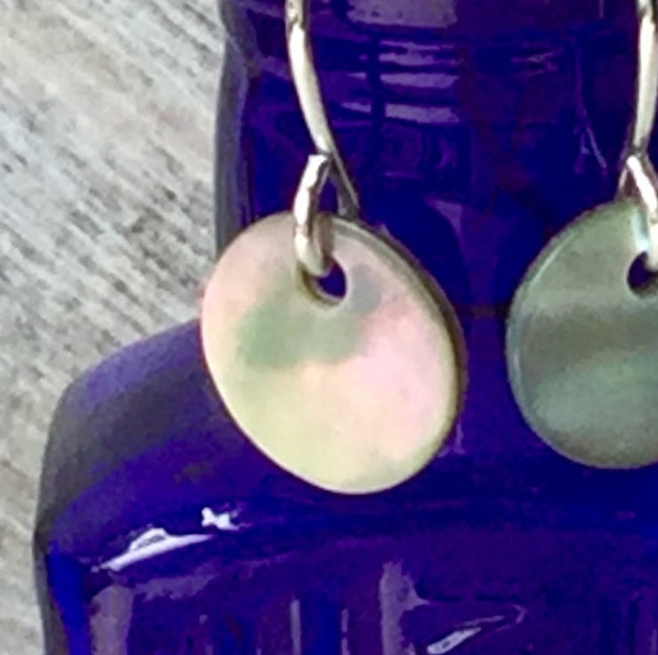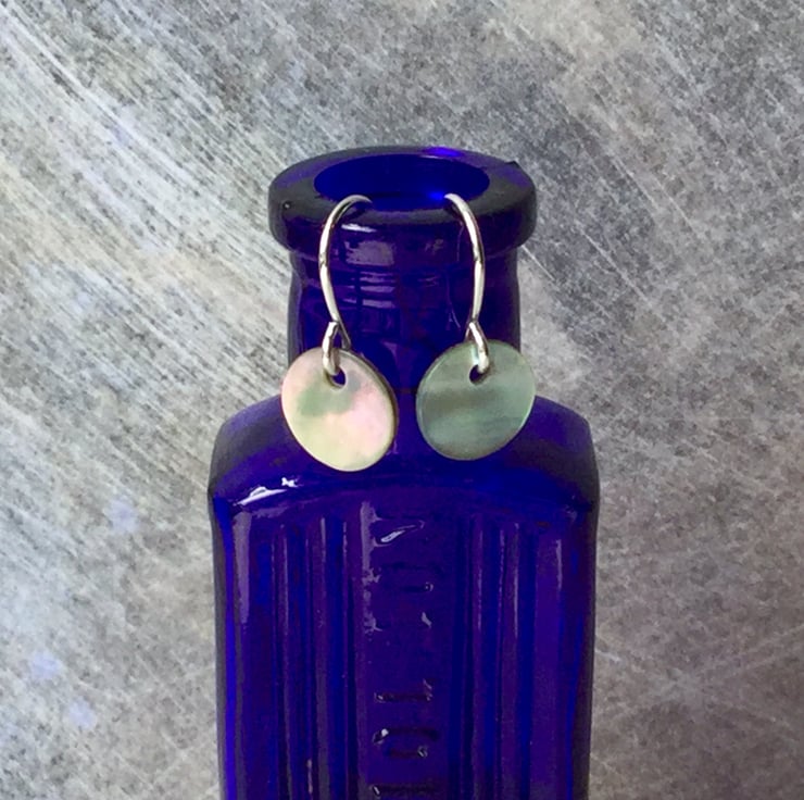 Simple and small round, natural Agoya shell drop earrings, on silver plated stems.