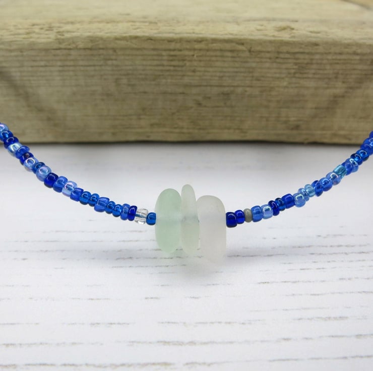 Simple style necklace with three pieces of Cornish sea glass and a mix of little glass seed beads.