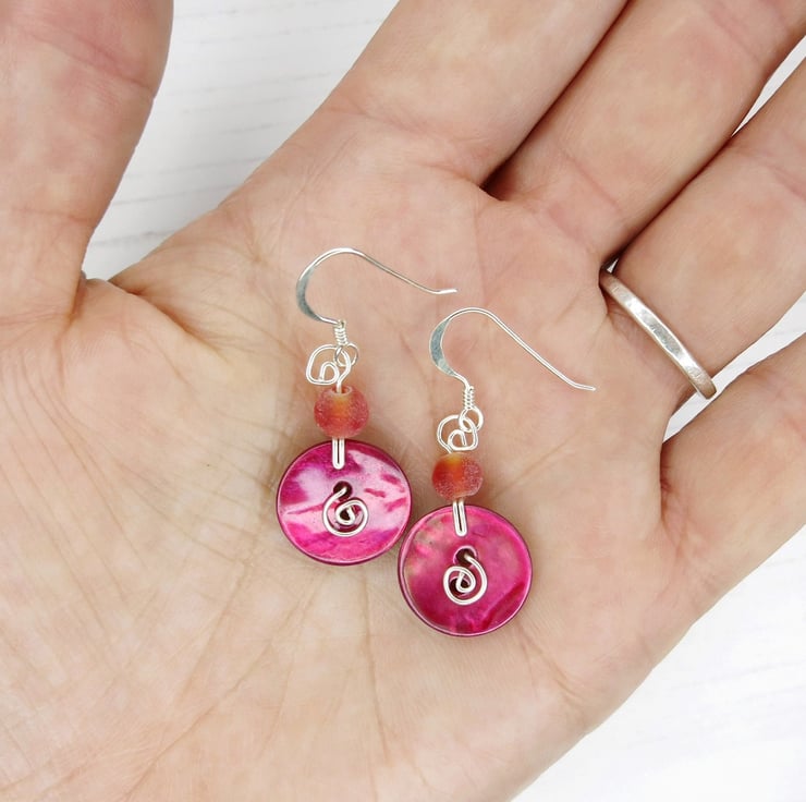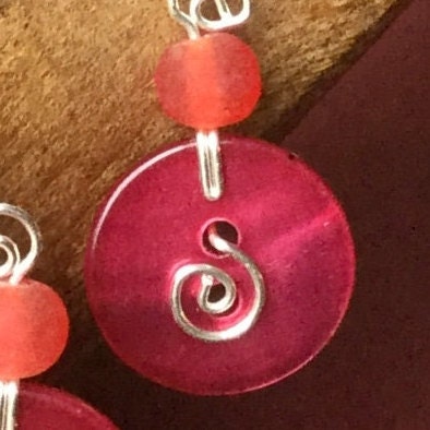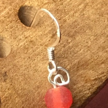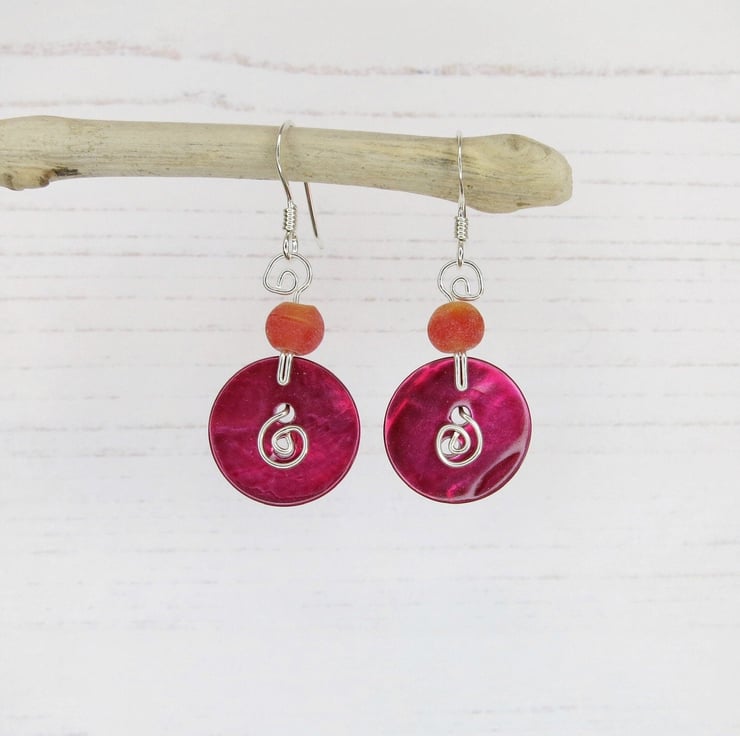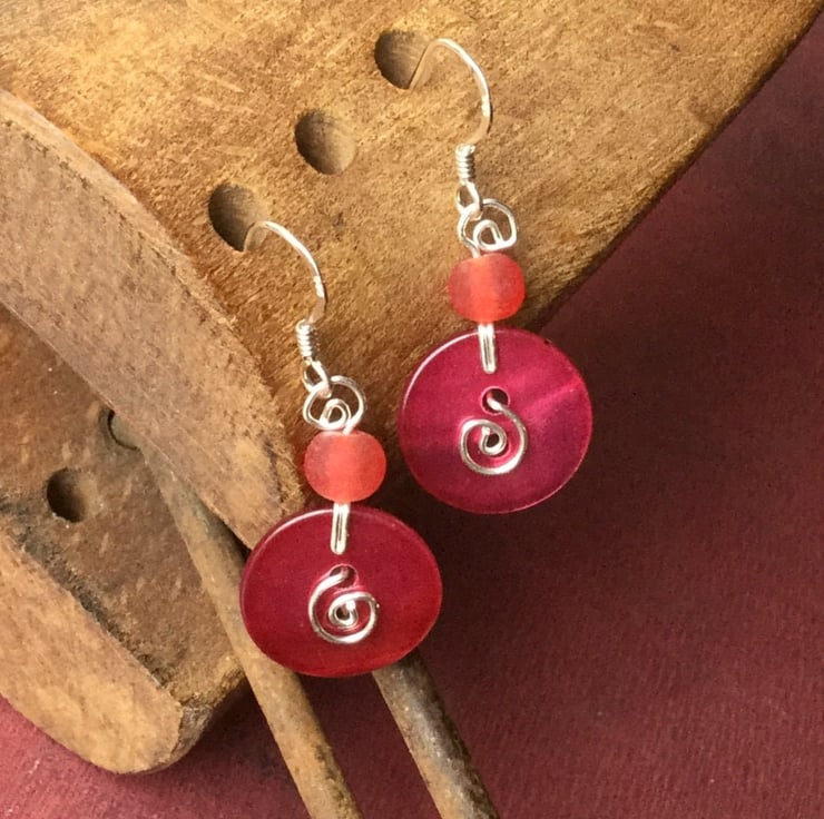 Red coloured shell button earrings, made using red frosted glass beads, silver plated wire and sterling silver stems.