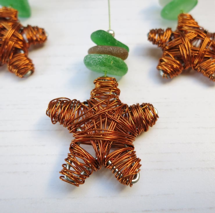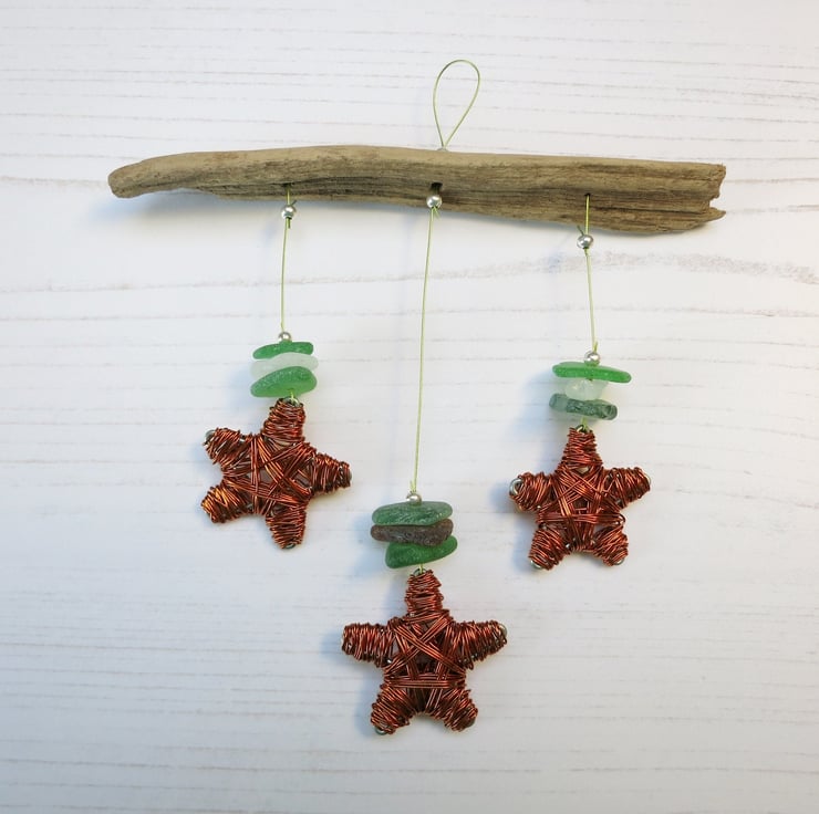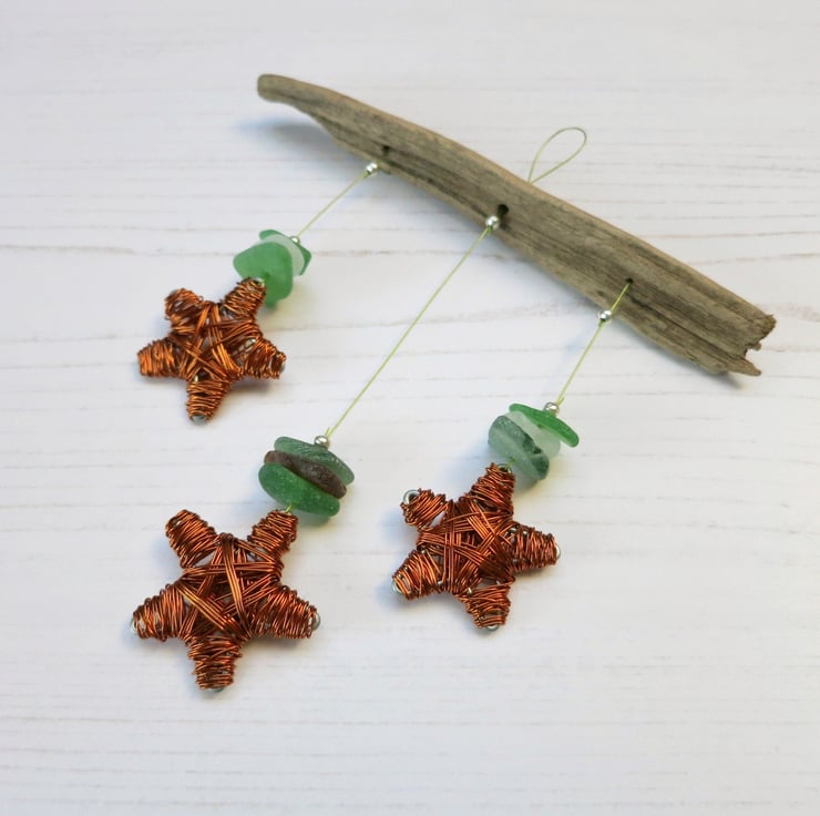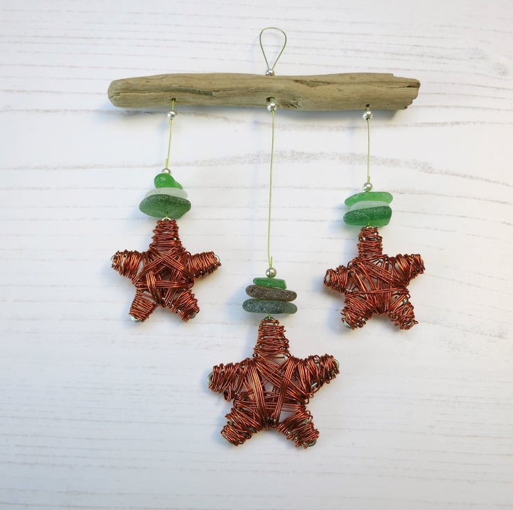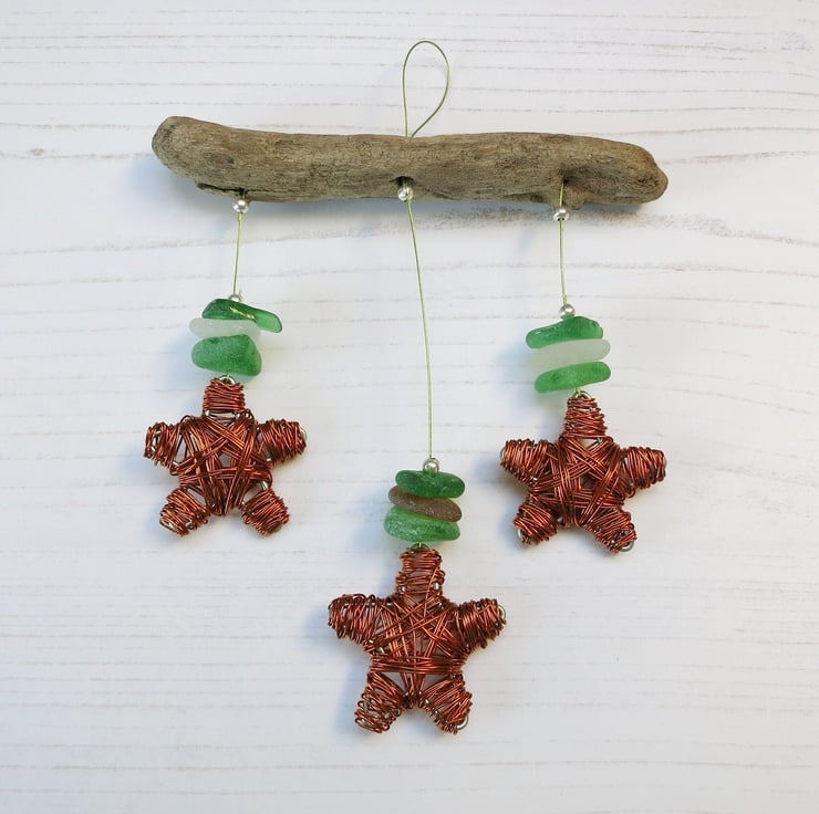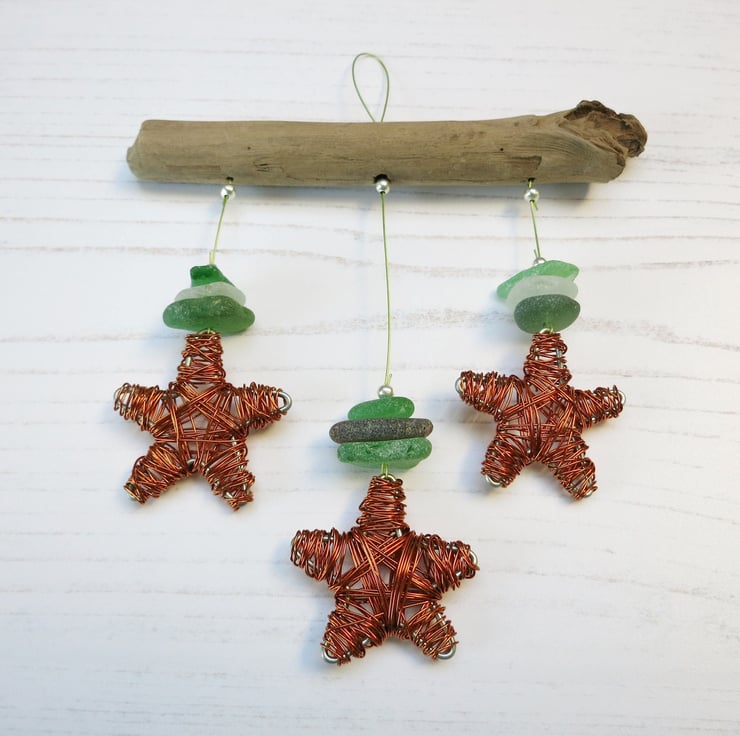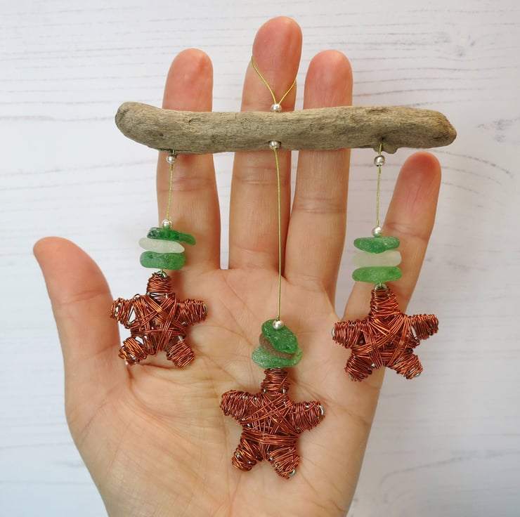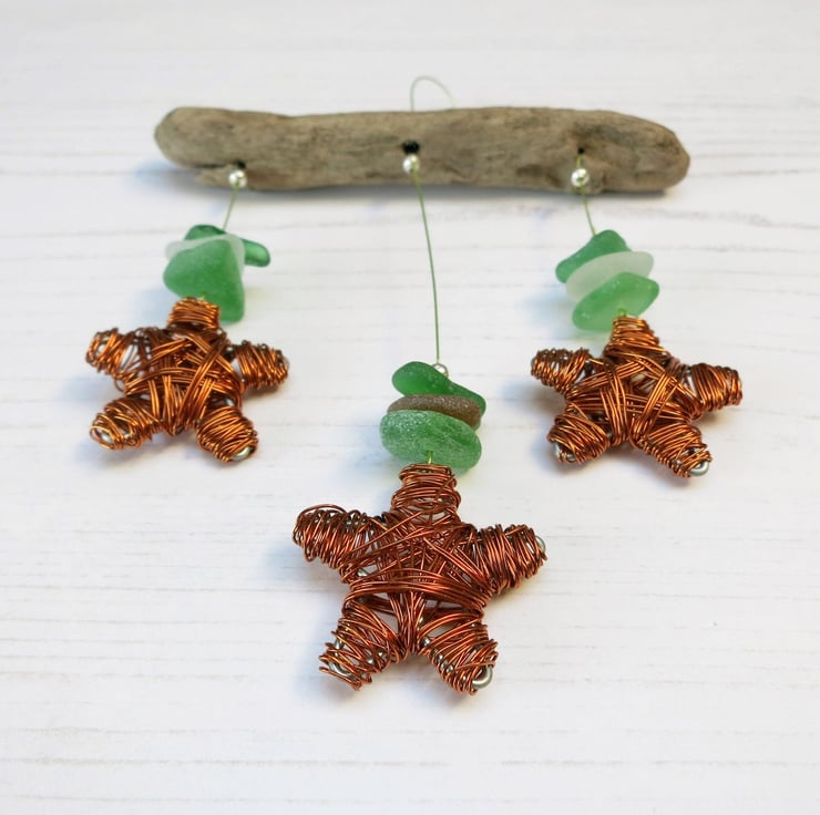 Dinky little decorative mobile. Each star has been handmade and wrapped in copper wire. Three pieces of Cornish sea glass have then been added to each star before being attached to a piece of driftwood.