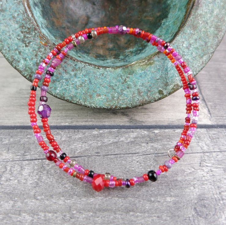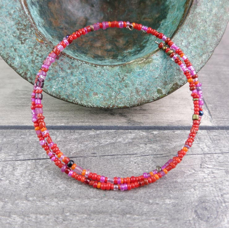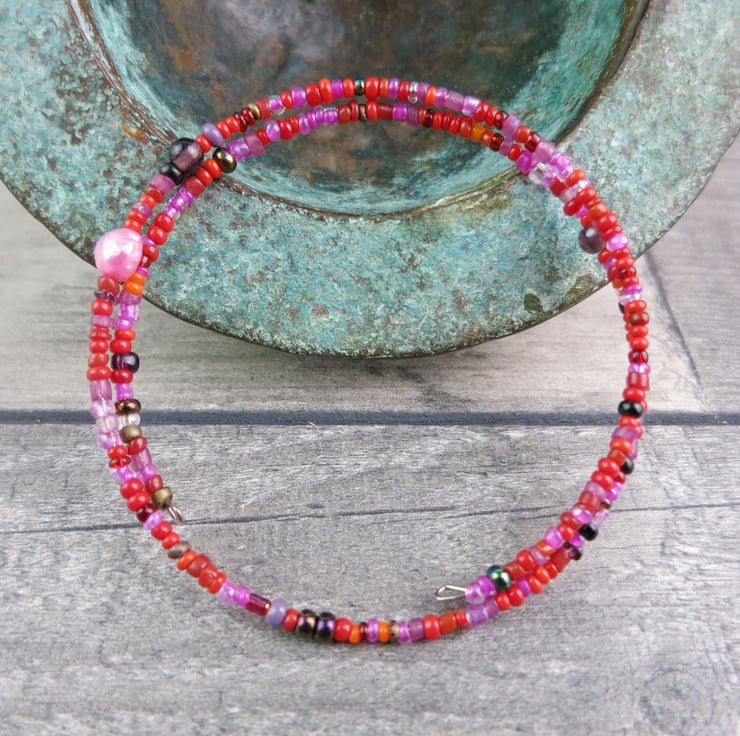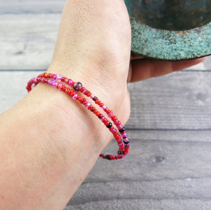 Dainty coiled bracelet, made using a mix of tiny red and pink beads.