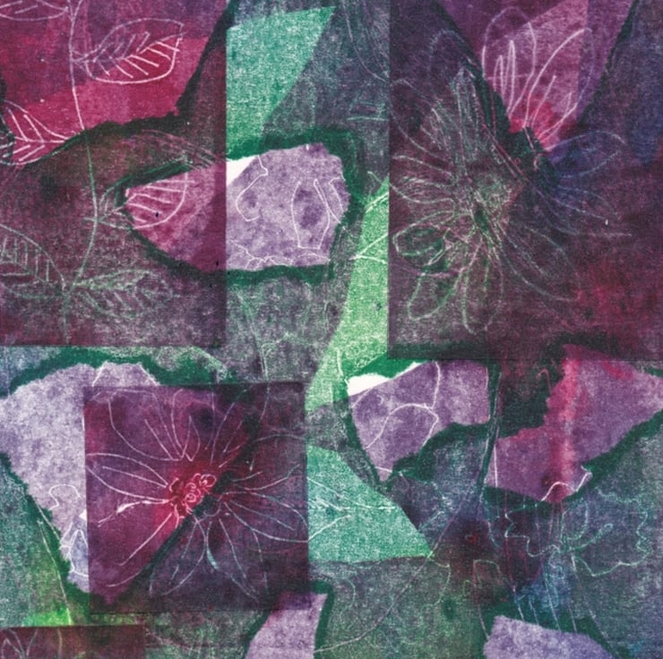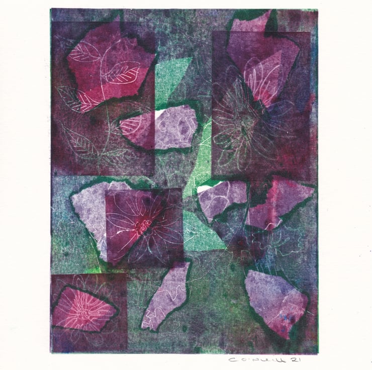 Multi layered monoprint, beautiful tones of greens and purples. Leaves and flowers are sketched into the ink and printed.