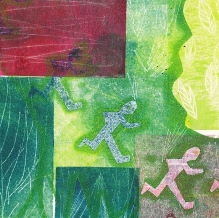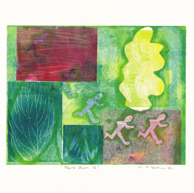 Abstract design of my local park run. This is a one off artwork. There are lots of layers to this print where I have blocked sections out and printed. Started with and one large piece of acetate inked up. And smaller pieces with individual mini mono prints worked on top.
