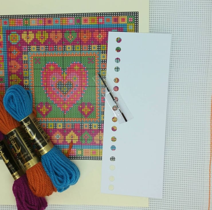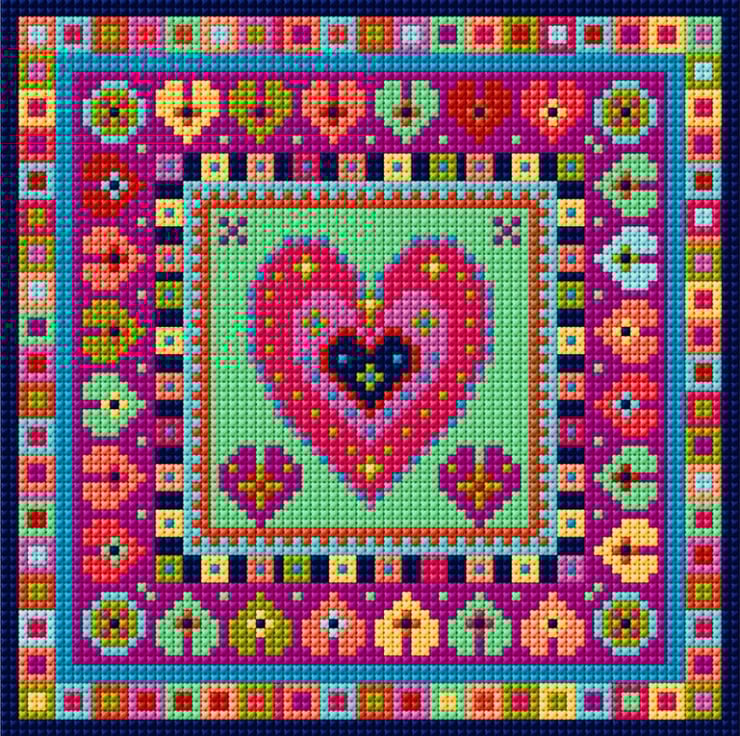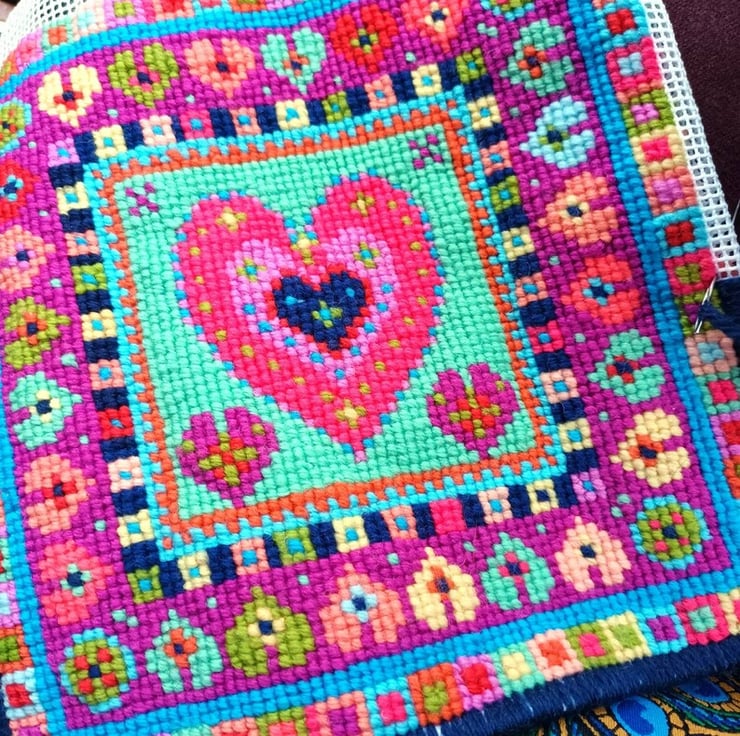 New Little Heart Tile Tapestry Kit, a fabulous and fun folk art needlework design in gorgeous rich wool colours.