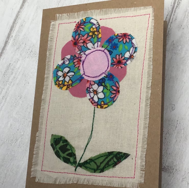 This card is decorated with an appliquéd flower in shades of pink and turquoise, sewn onto a piece of calico, previously used for a pattern fitting. The whole decoration has then been sewn on to a craft card which measures 10.5 x 15cm. The inside has been left blank so that you can add your own greeting. The back is stamped with our logo.