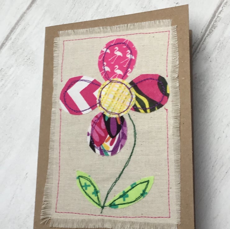 This card is decorated with an appliquéd flower in shades of pink, sewn onto a piece of calico, previously used for a pattern fitting. The whole decoration has then been sewn on to a craft card which measures 10.5 x 15cm. The inside has been left blank so that you can add your own greeting. The back is stamped with our logo.