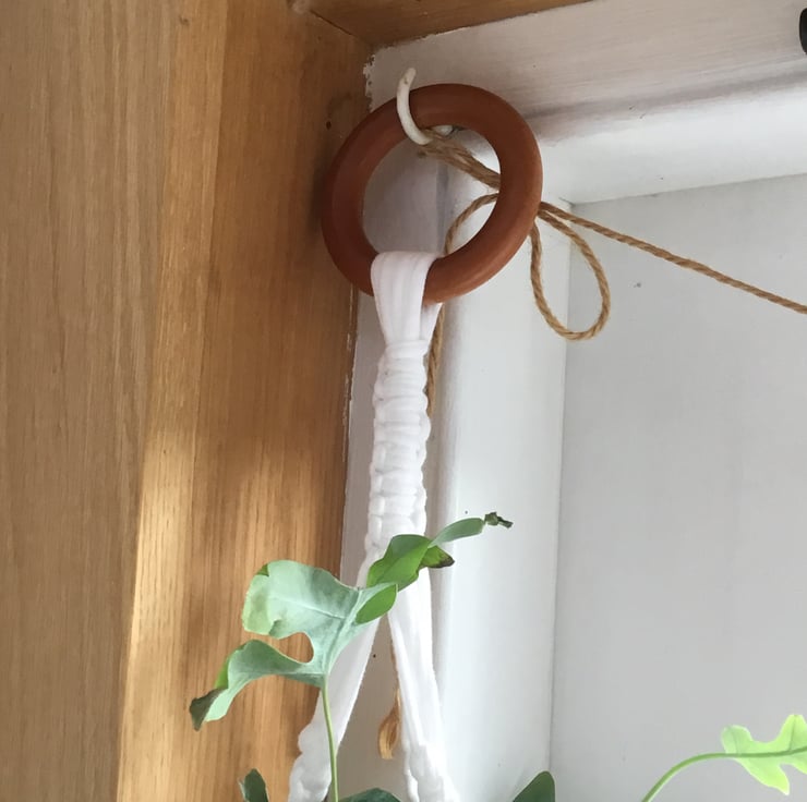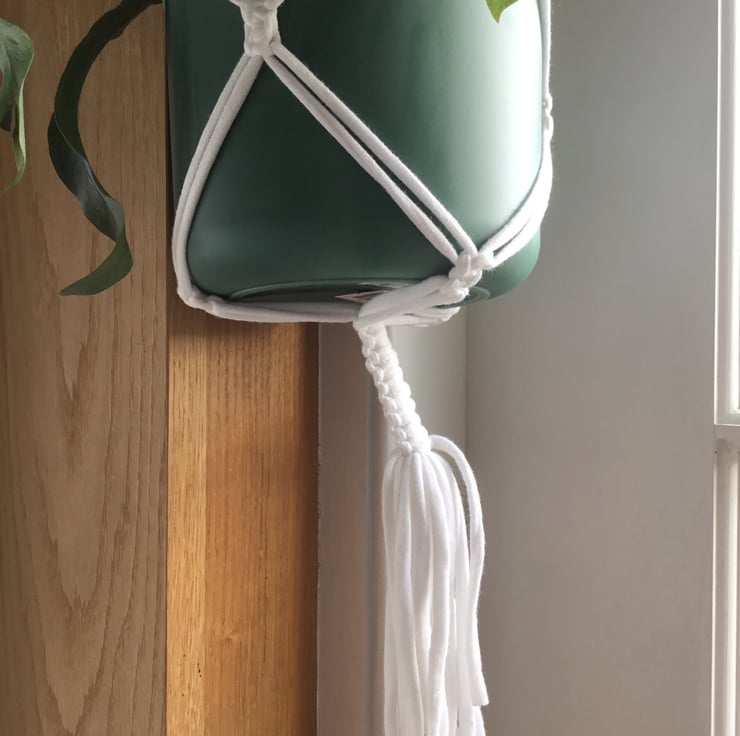 This plant holder has been made using the tee shirt yarn formed from an unloved white tee shirt, combined with a ‘surplus to requirement’ wooden curtain ring. Macrame knotting techniques have been used, creating flat and spiral knots. The photos help to show some of the details.