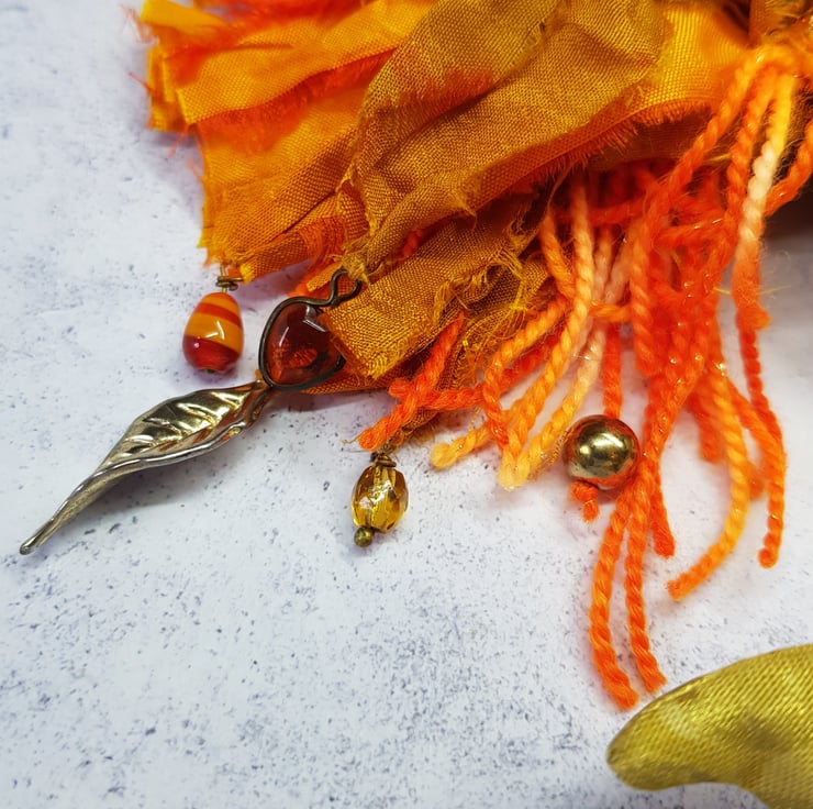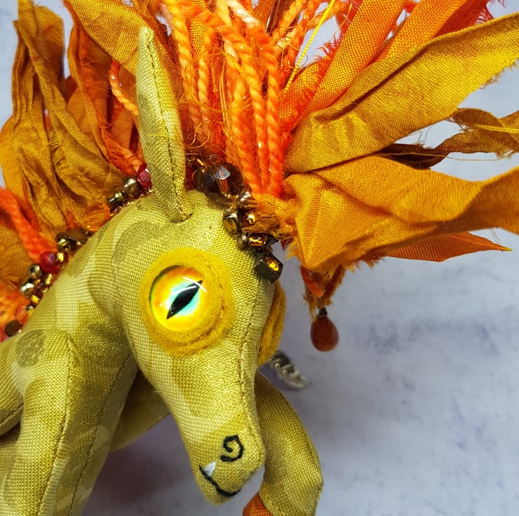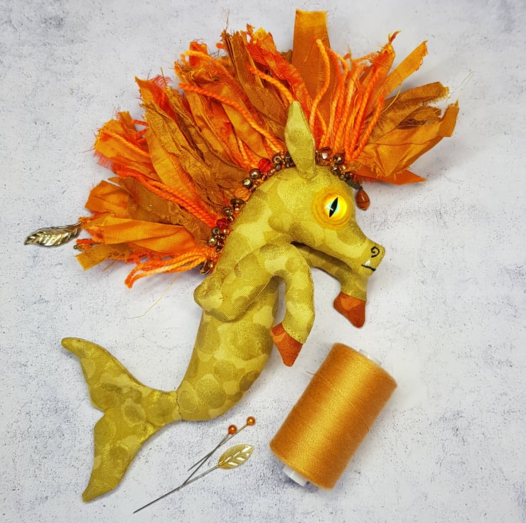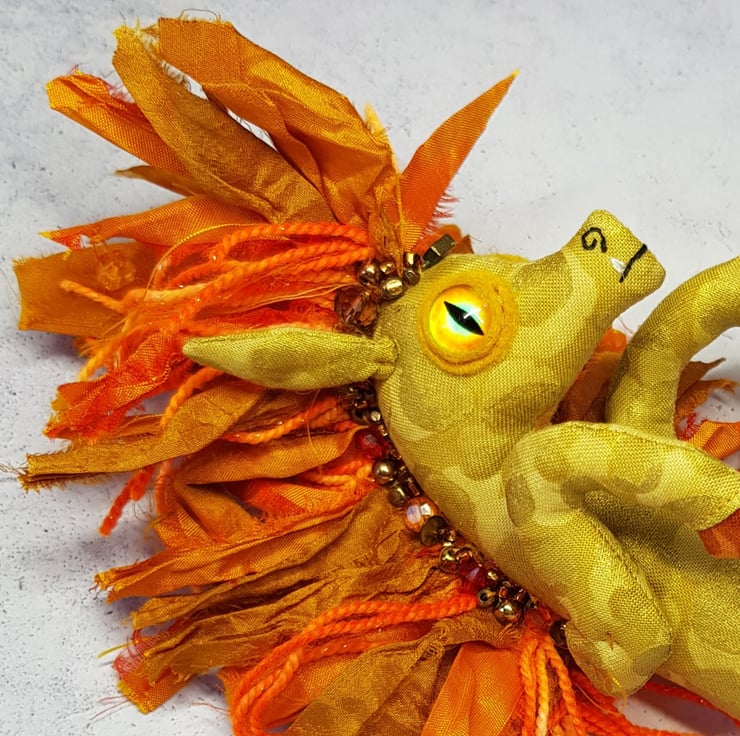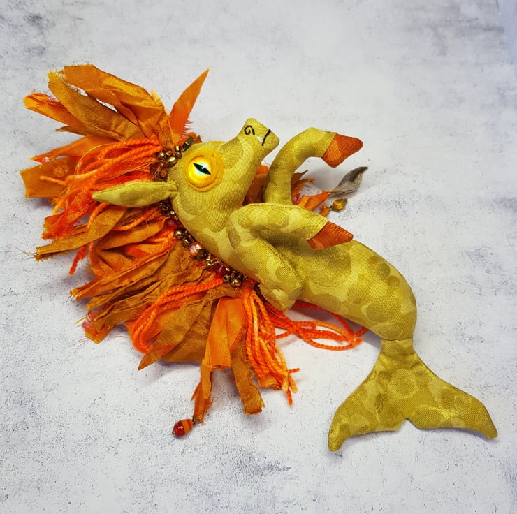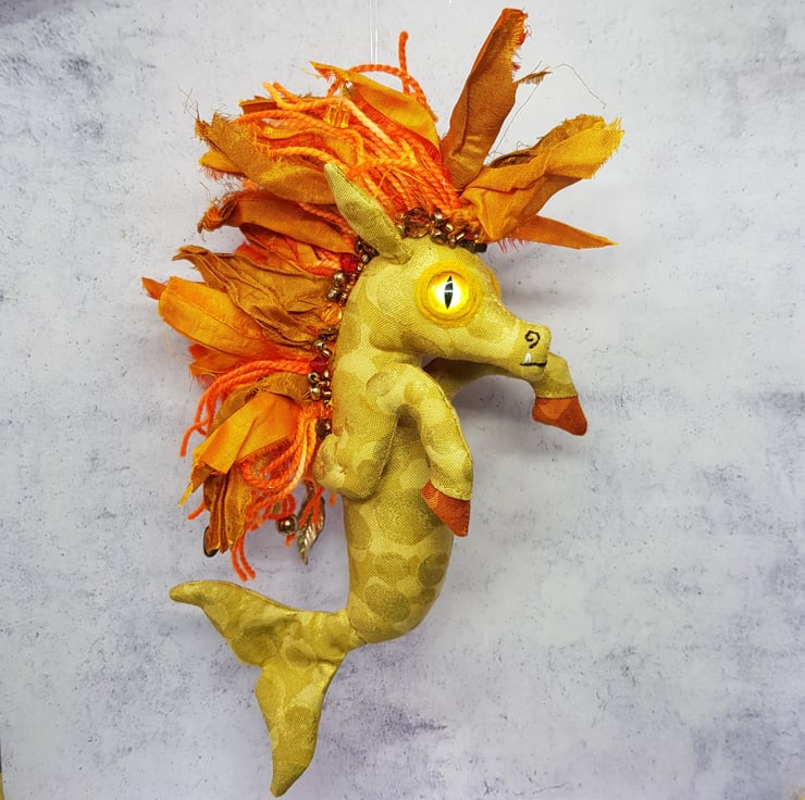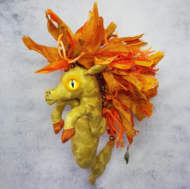 This Kelpie is made from multi tonal cotton fabric with glass eyes in a felt surround. The nostrils and mouth are hand embroidered and the front legs sewn into place. The mane is hand sewn into place and decorated with upcycled gems and beads. The main includes sparkly yarn and multicoloured recycled sari silk. The kelpie measures roughly 10 inches tall. This piece is for decorative purposes only and not a toy. Comes with a transparent loop hanger.