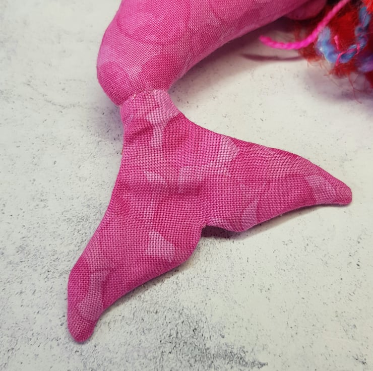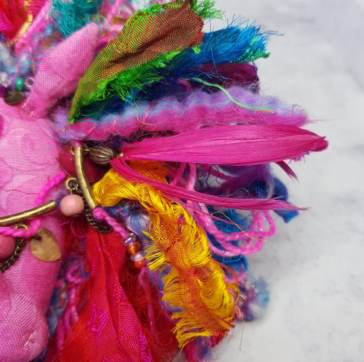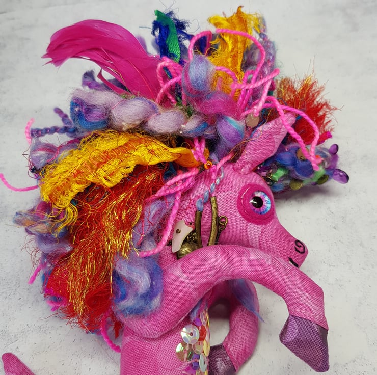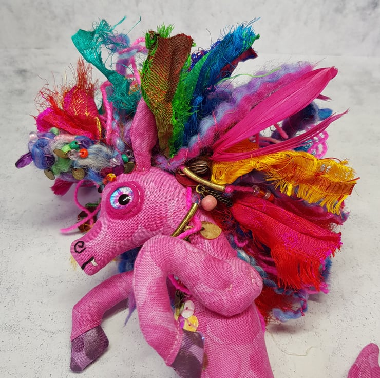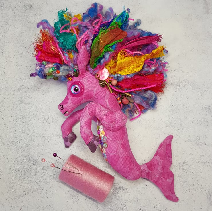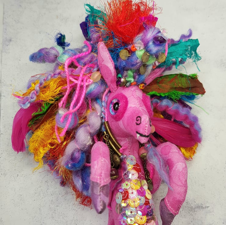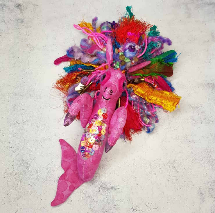 This Kelpie is made from multi tonal cotton fabric with glass eyes in a felt surround. The nostrils and mouth are hand embroidered and the front legs sewn into place. The mane is hand sewn into place and decorated with upcycled gems and beads. The mane includes two different hand spun sparkly yarn and multicoloured recycled sari silk. This kelpie has Multicoloured sequins hand sewn onto the belly. The kelpie measures roughly 10 inches tall. This piece is for decorative purposes only and not a toy. Comes with a transparent loop hanger.
