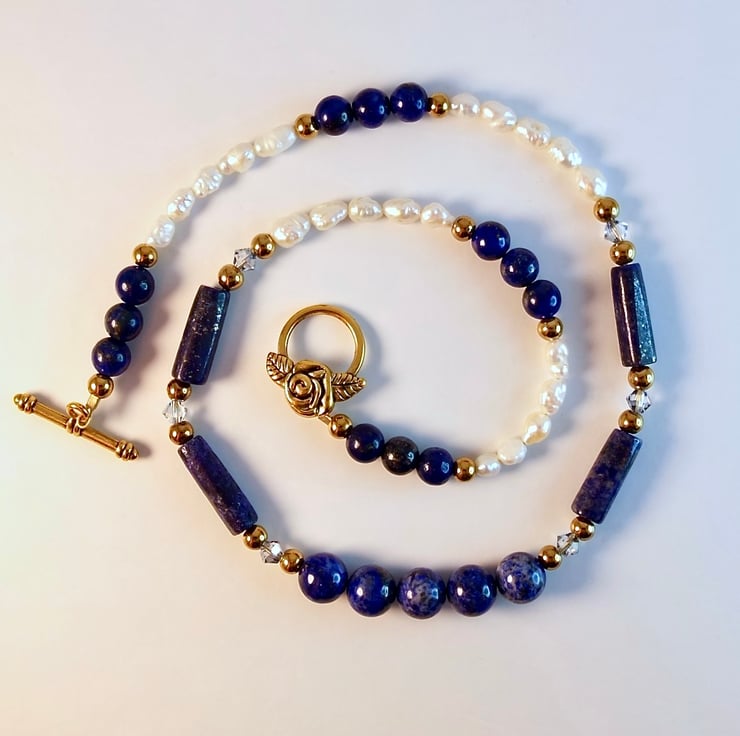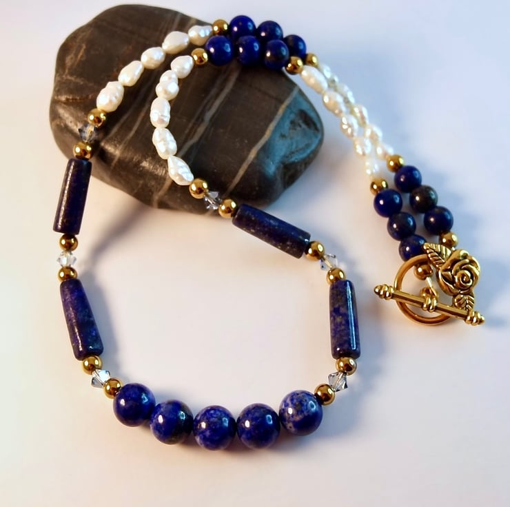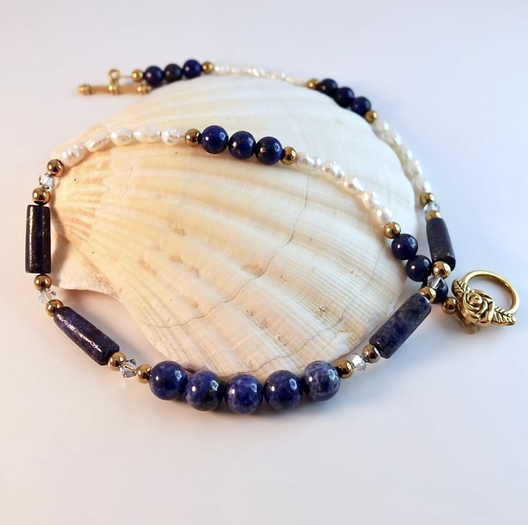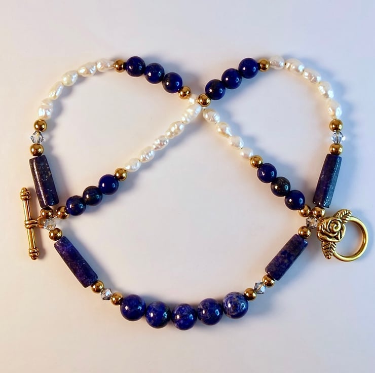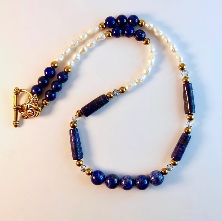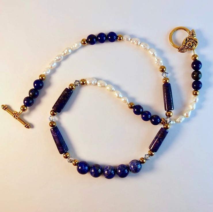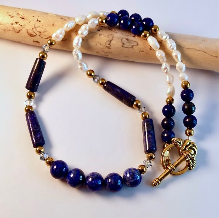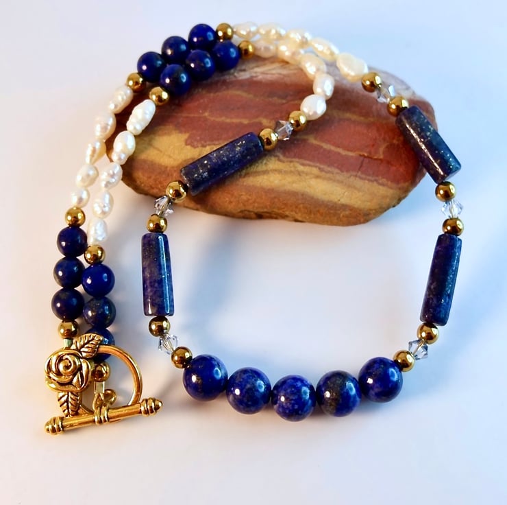 A mix of Lapis Lazuli and creamy-white Freshwater Pearls are embellished with 4mm gold Hematite.