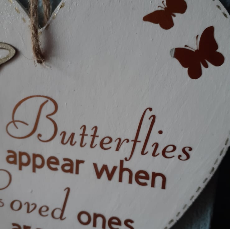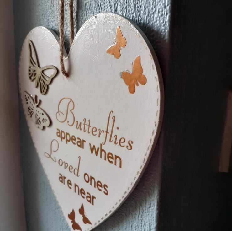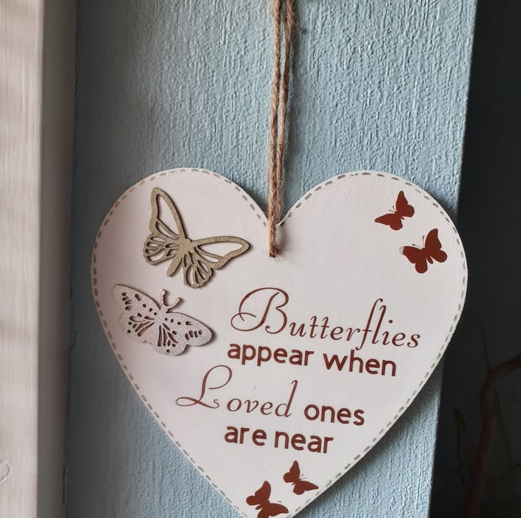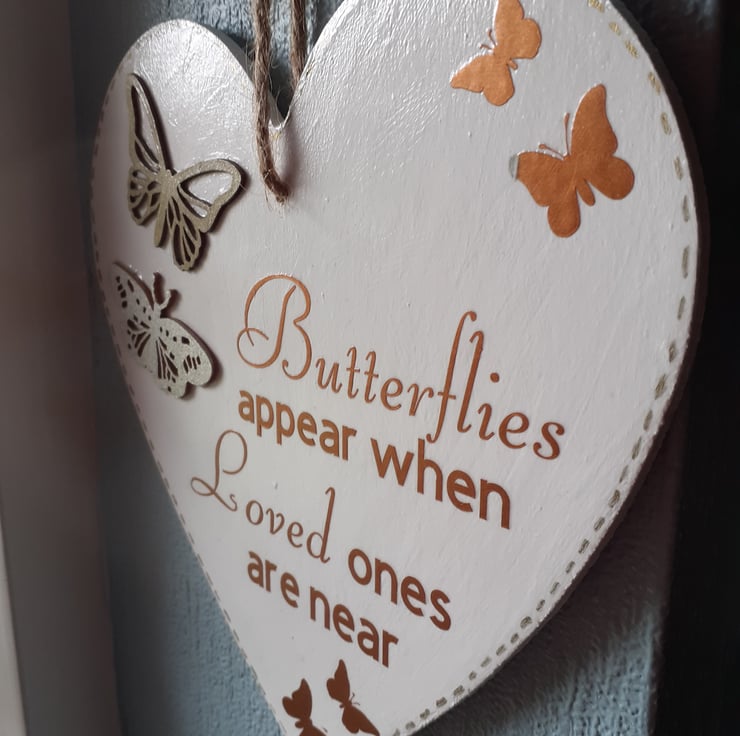 Butterflies appear when loved ones are near is the sentiment on this hand painted heart shaped wall decoration.
