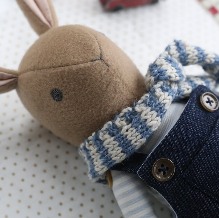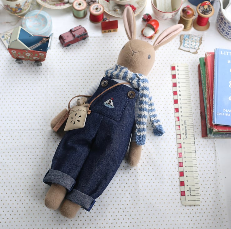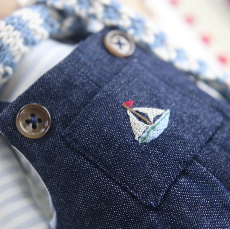 He is wearing removeable denim dungaree, lined with pale blue gingham. His pocket is hand embroidered with a little sailing boat and he wears a striped scarf knitted from beautiful Rowan yarn.