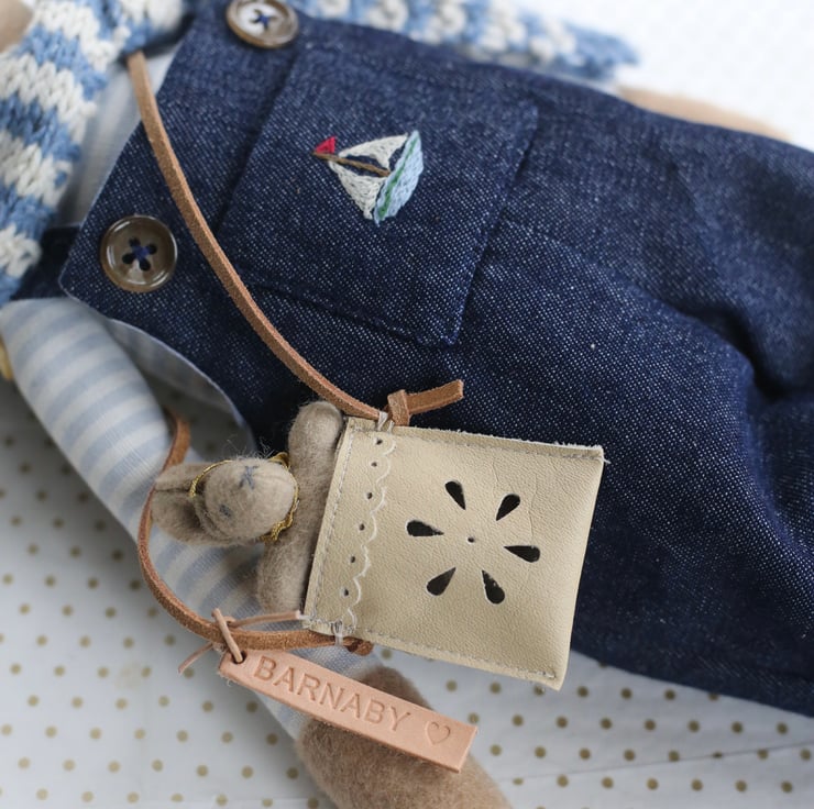 He has a tiny leather bag, hand punched with a daisy design and containing a baby bunny with a ric rac tie.