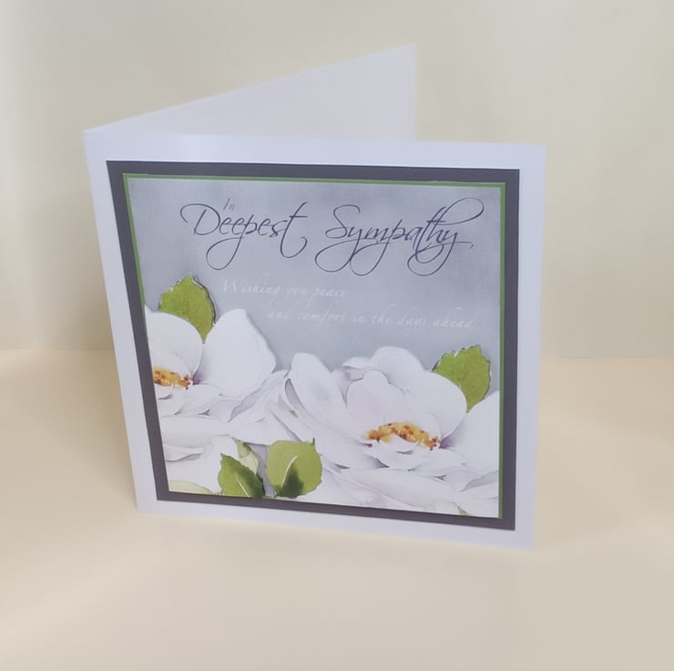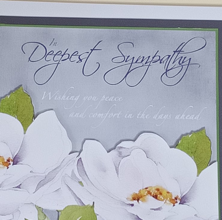 The topper for this card features an image of white roses across the bottom with the words "in Deepest Sympathy, Wishing You Peace and Comfort in The Days Ahead" I've cut and extra layer of roses and placed them on the topper using 3D foam pads to add dimension. I've layered the whole image onto green and dark grey papers before placing onto a white card blank.