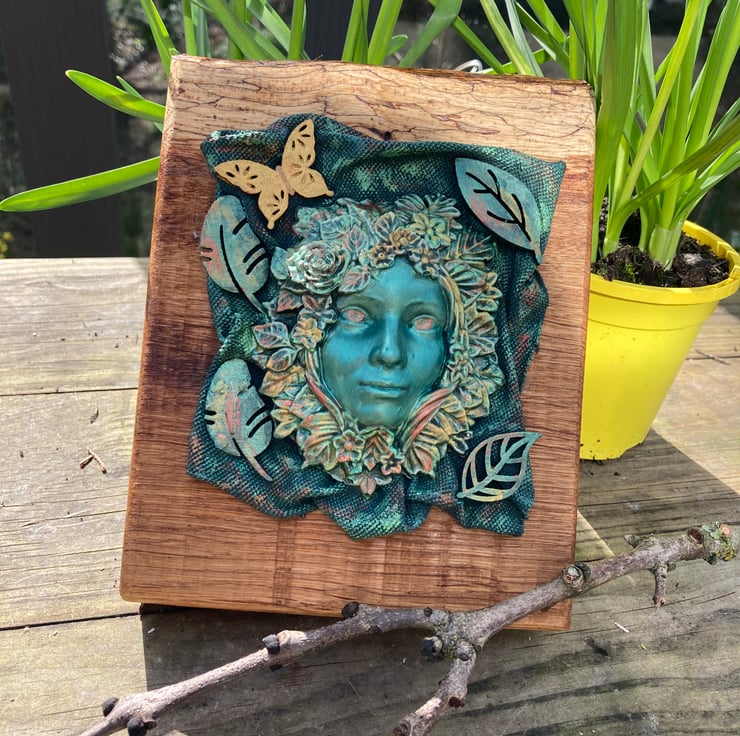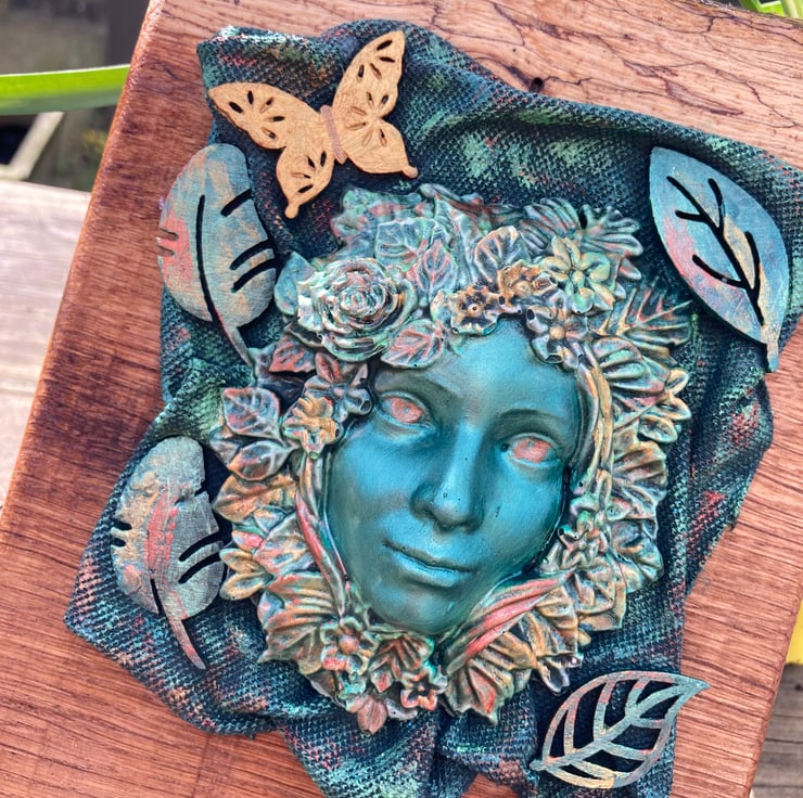 This perfectly complements the Green Man range. This is a slightly smaller slab of wood, approx 18cm x 14cm. This is made with a cast jesmonite head and embellishments, mounted with Powertex , with a hanging facility on the reverse.