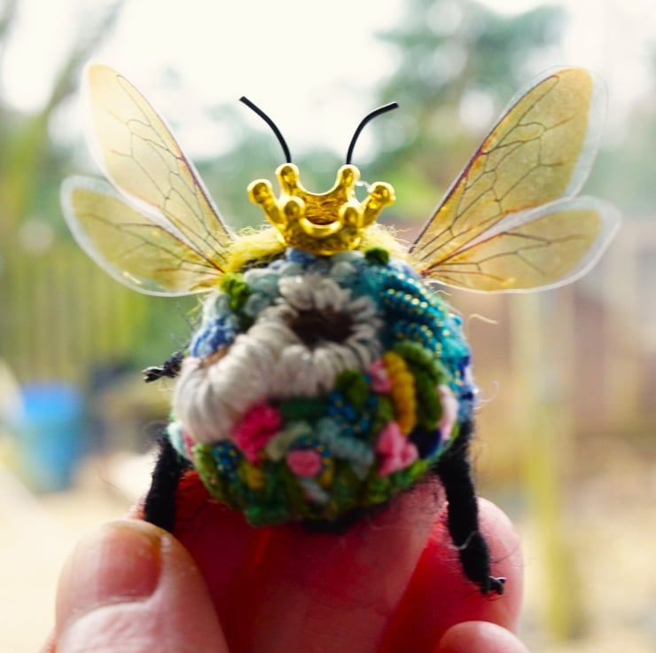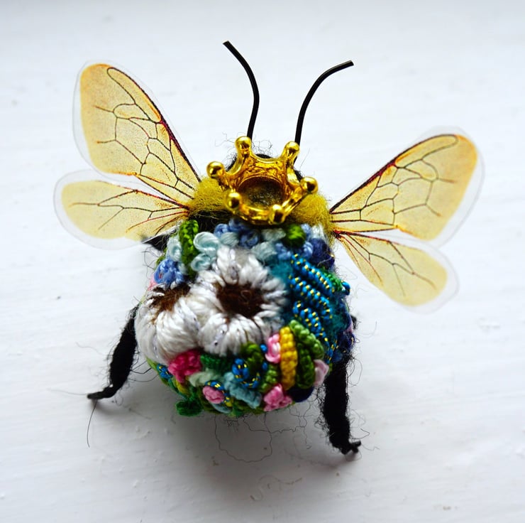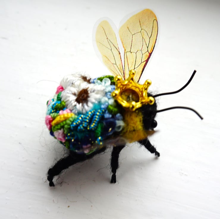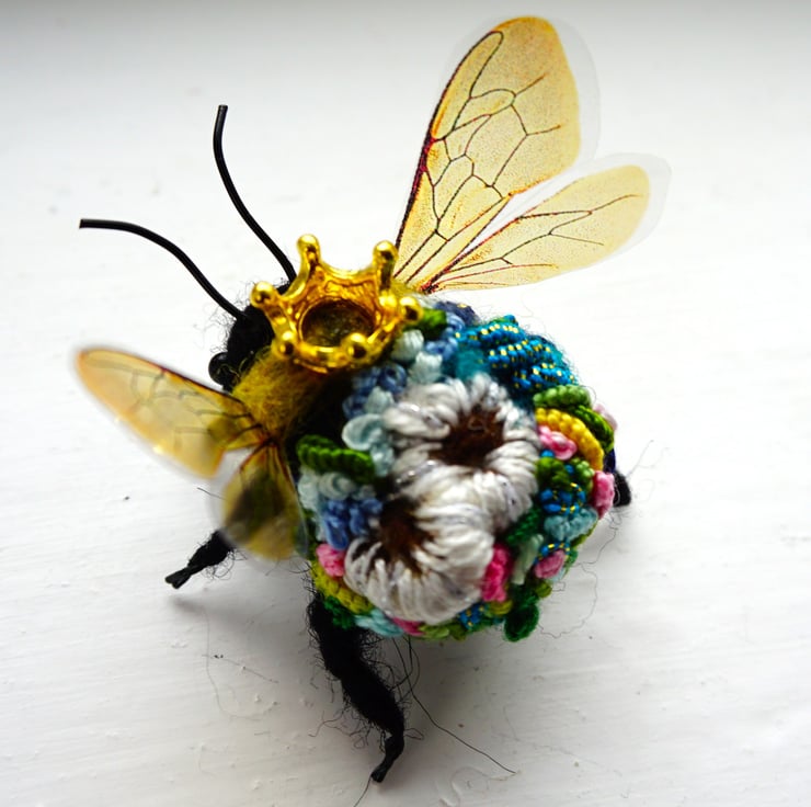 Needle felted and embroidered queen bee,,complete with tiny crown. measures approx 3 cm long by 5cm wide .Your bee will come with a fine gold hanging thread ,which can be snipped off if not required,Gift box included.This is actual bee you will purchase.